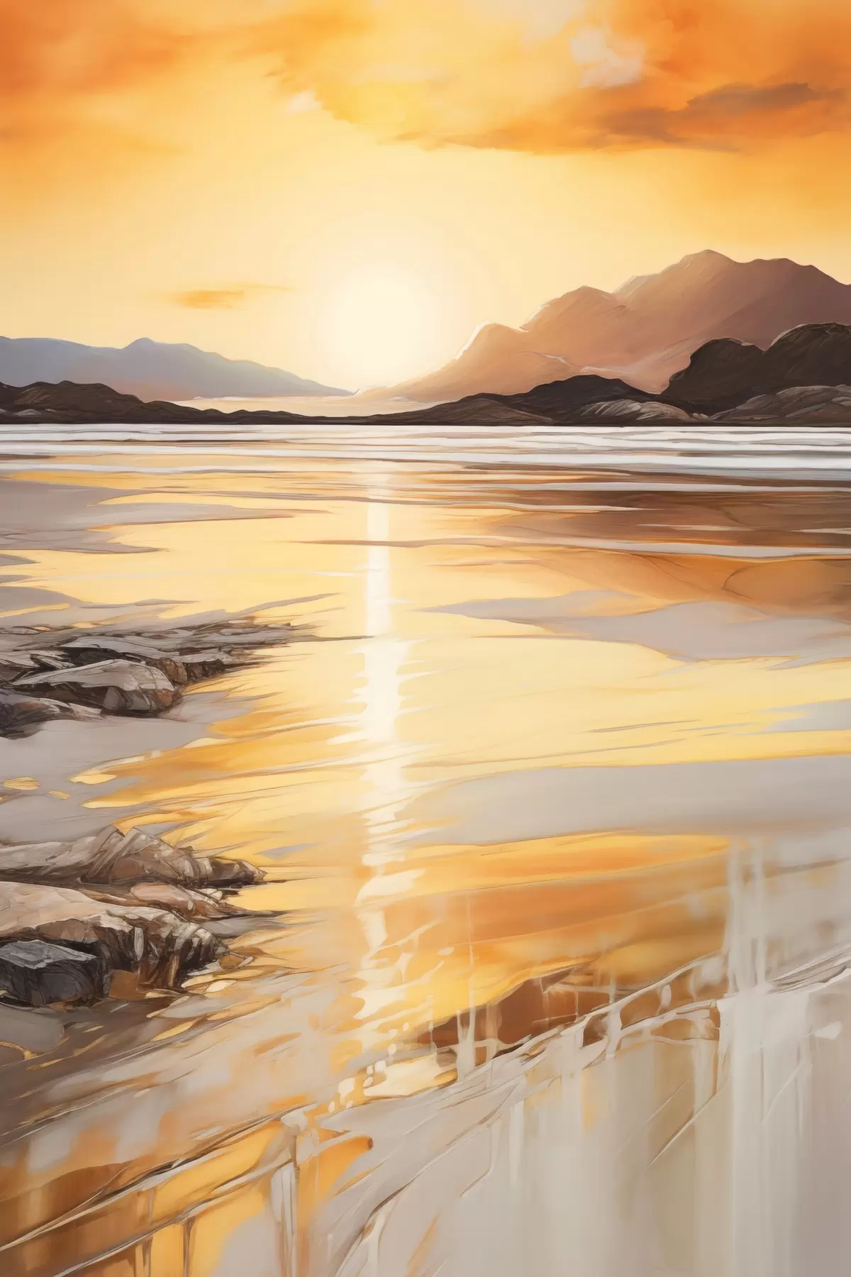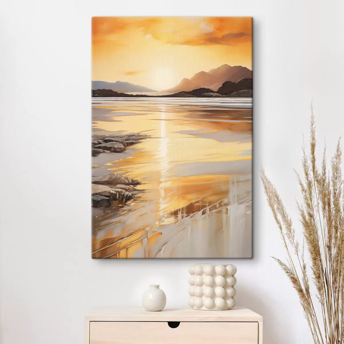 Obraz Krajobraz z rzeką i górami pod ciepłym, pomarańczowym niebem o zachodzie słońca Nr s48756