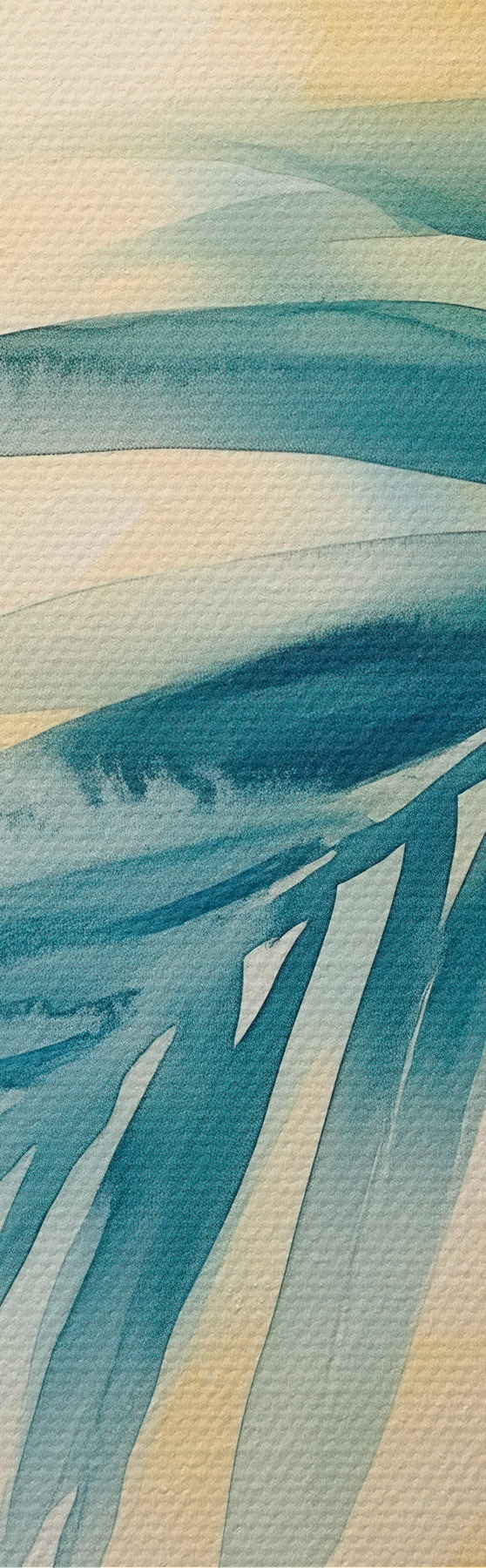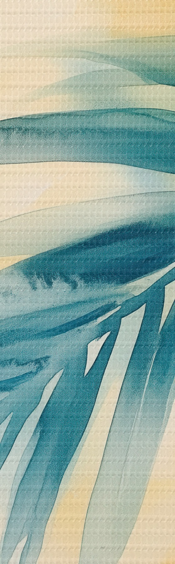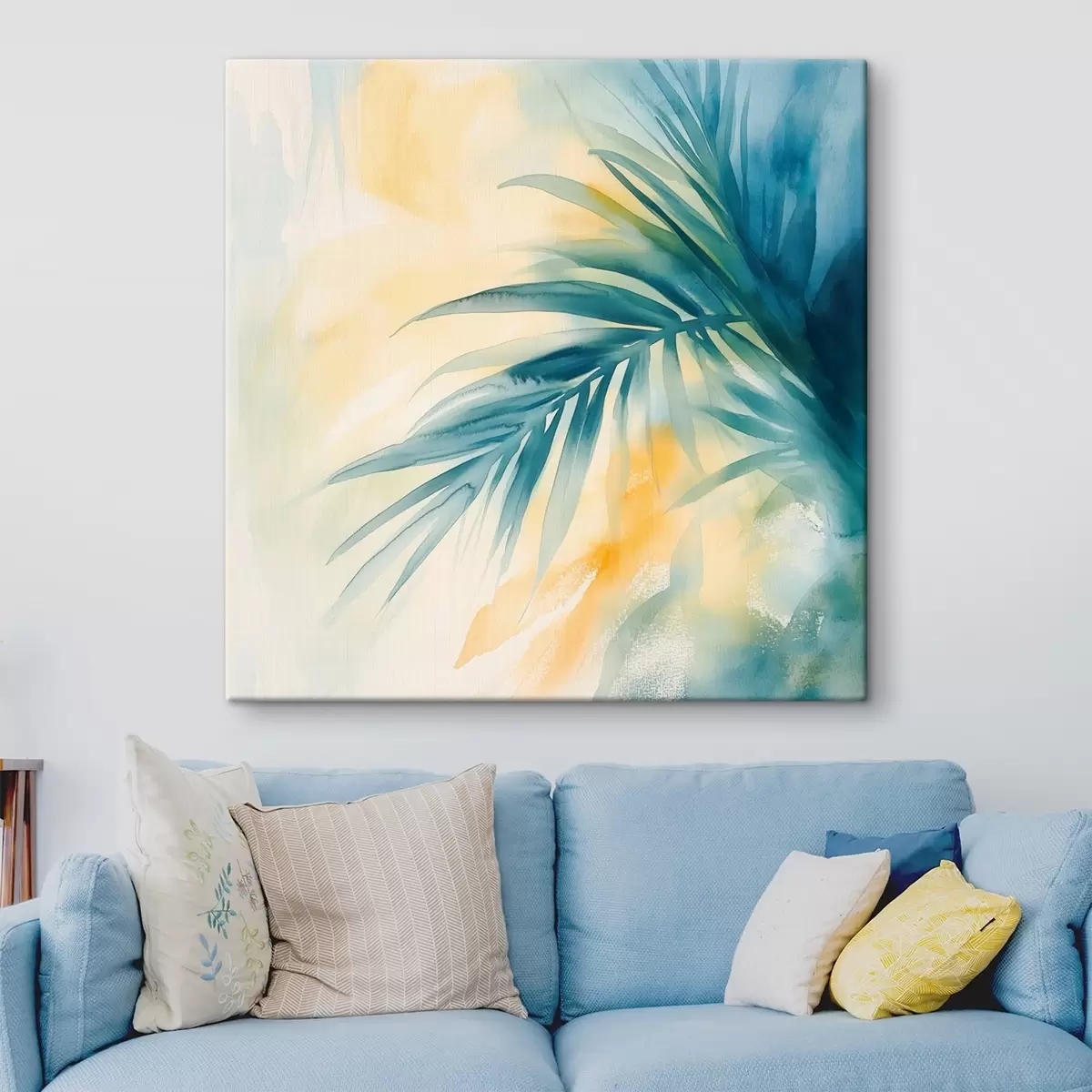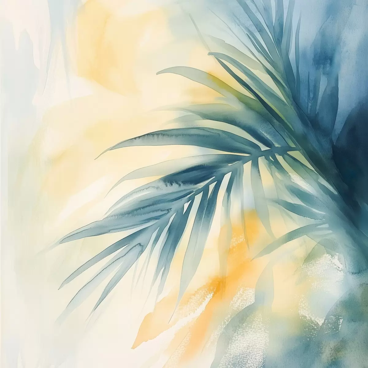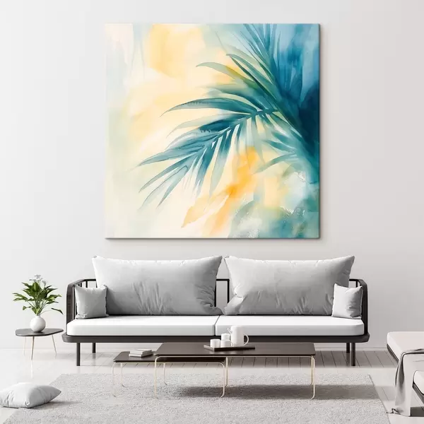 Obraz Tropikalne liście palmowe w niebiesko-turkusowej kolorystyce na tle ciepłych plam akwareli Nr s48849