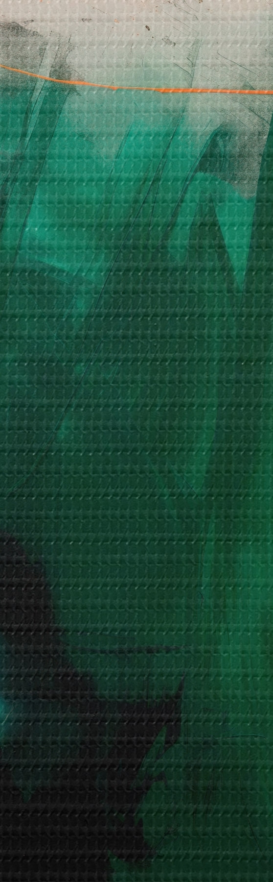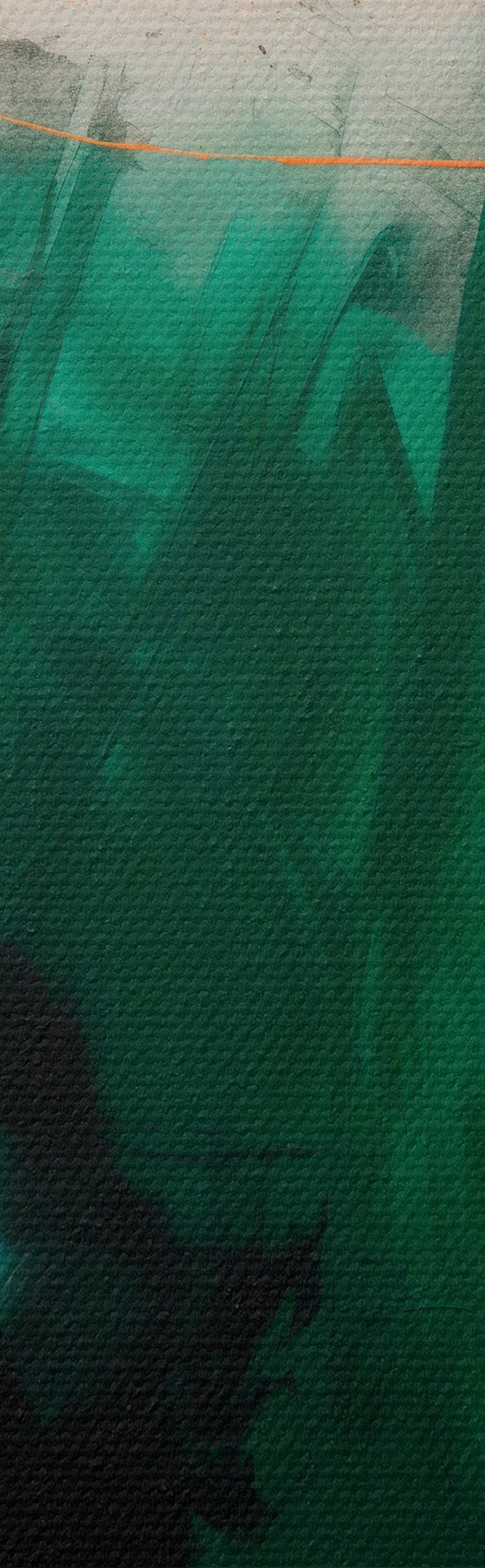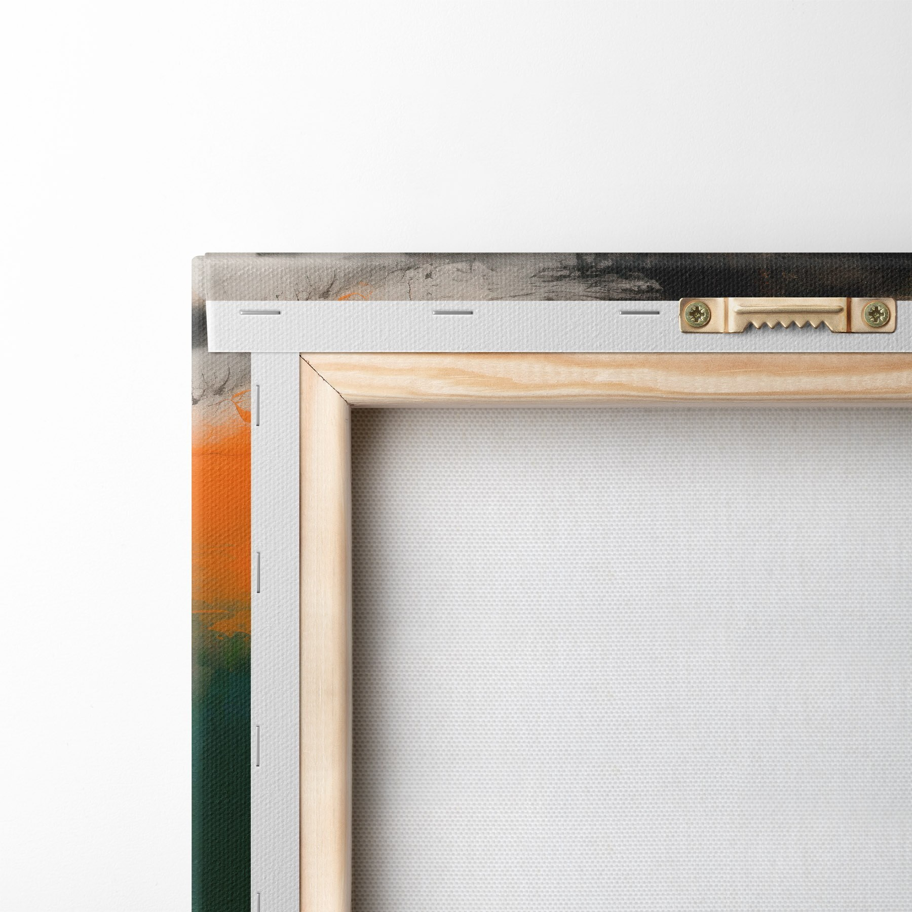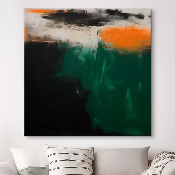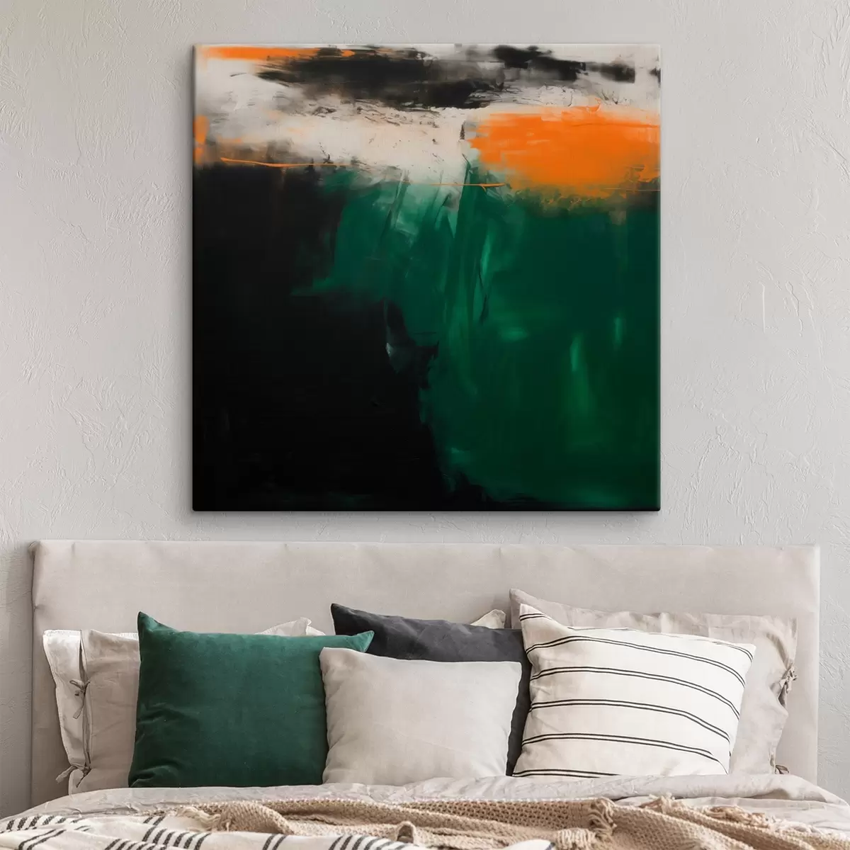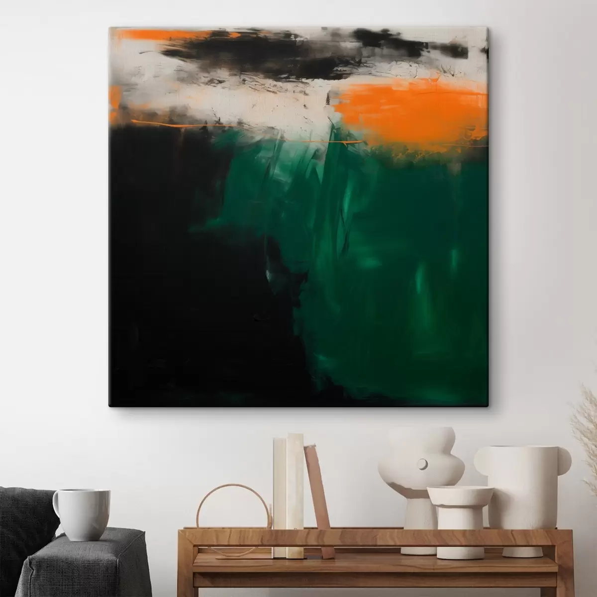 Obraz Abstrakcja z pomarańczowymi akcentami i ciemnozielonymi pociągnięciami pędzla w nowoczesnym stylu malarskim Nr s48865