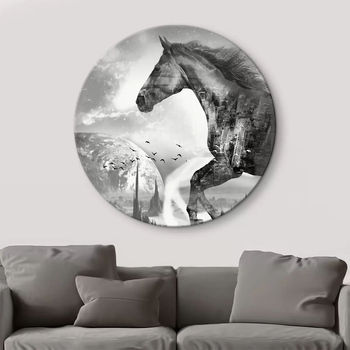 Okrągłe obrazy Koń, świat e czarno-biały r02412