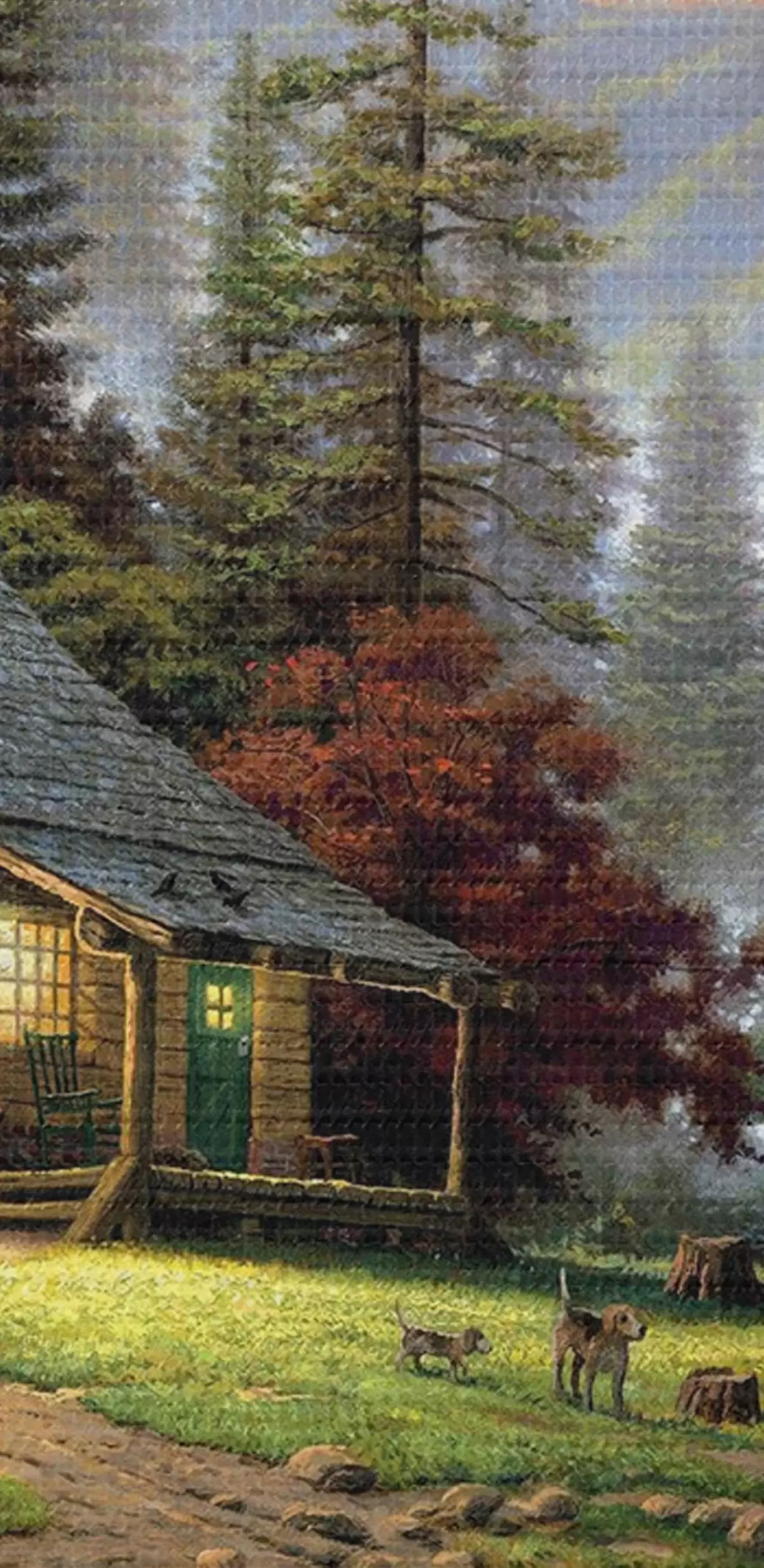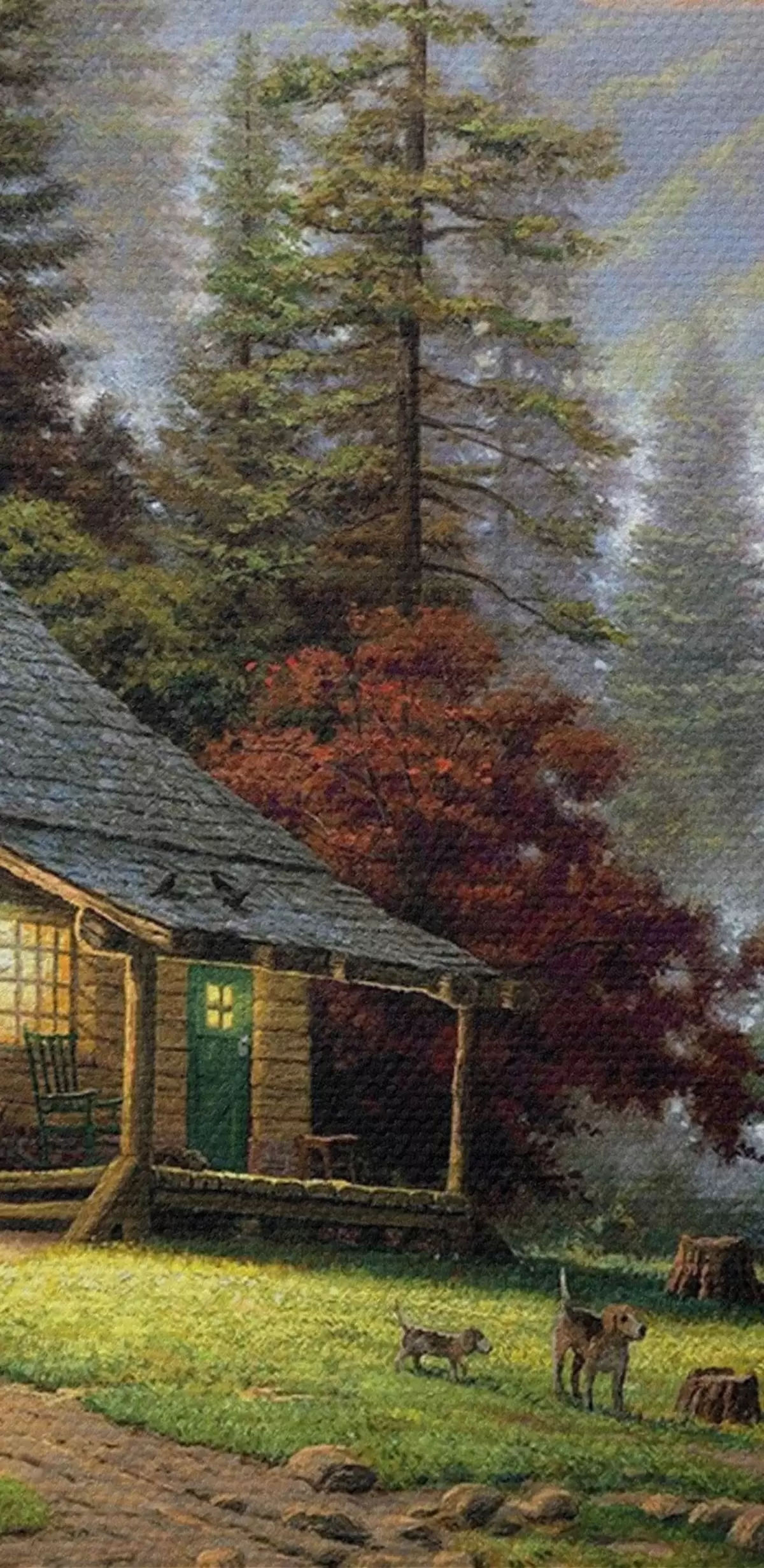 Okrągłe obrazy Chata rybacka w lesie w pobliżu strumienia r15556