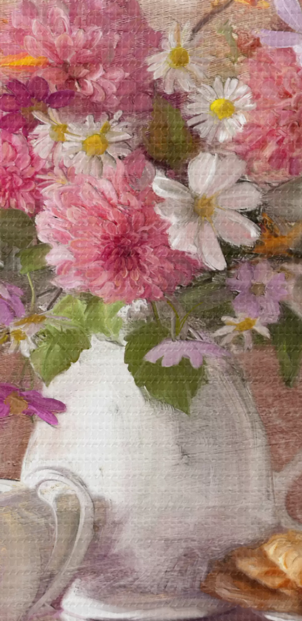 Okrągły obraz Zestaw do herbaty z bukietem delikatnych różowych kwiatów Nr r29240