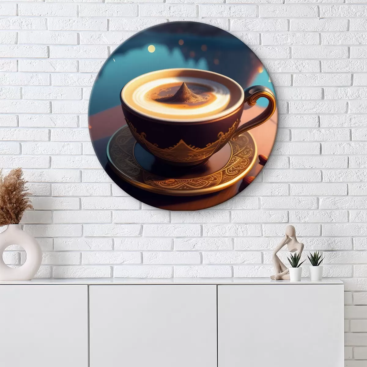 Okrągły obraz Kawa na tle górskiego krajobrazu Nr r32140