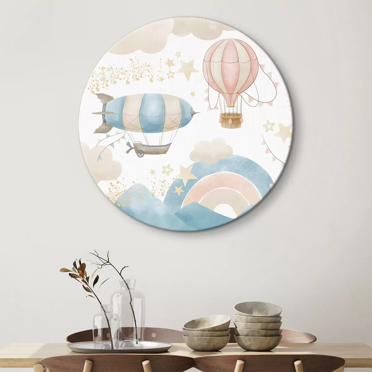 Okrągły obraz Balony na ogrzane powietrze z chmurami i tęczą Nr r32431