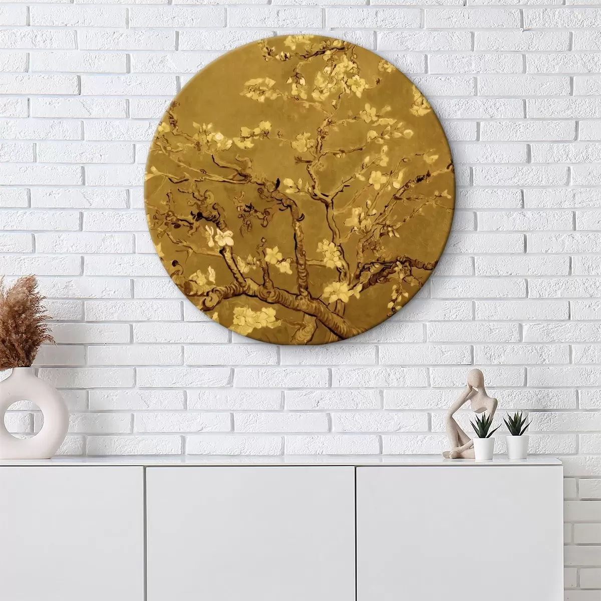 Okrągły obraz Kwitnące gałązki migdałowca w złotych odcieniach Nr r35609