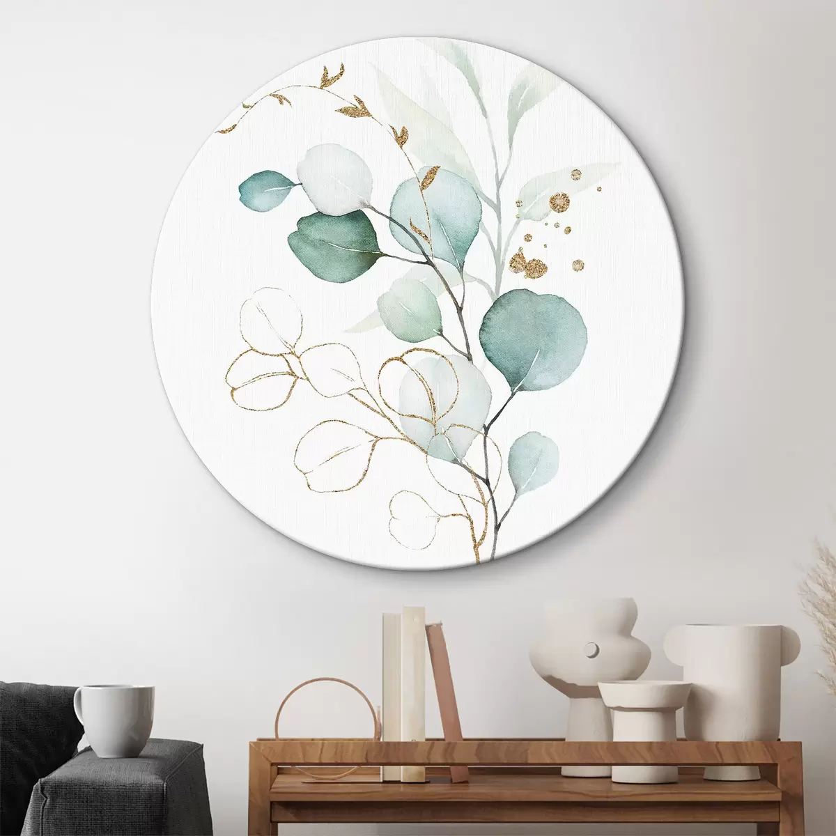 Okrągły obraz Akwarela przedstawiająca gałąź z niebieskimi liśćми Nr r36138