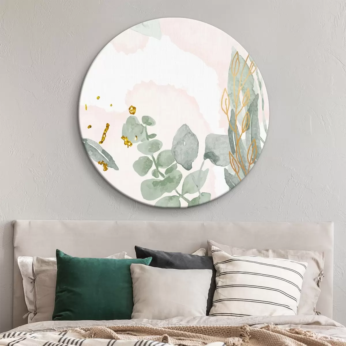 Okrągły obraz Kompozycja z gałęzi eukaliptusa na delikatnym akwarelowym tle Nr r36361