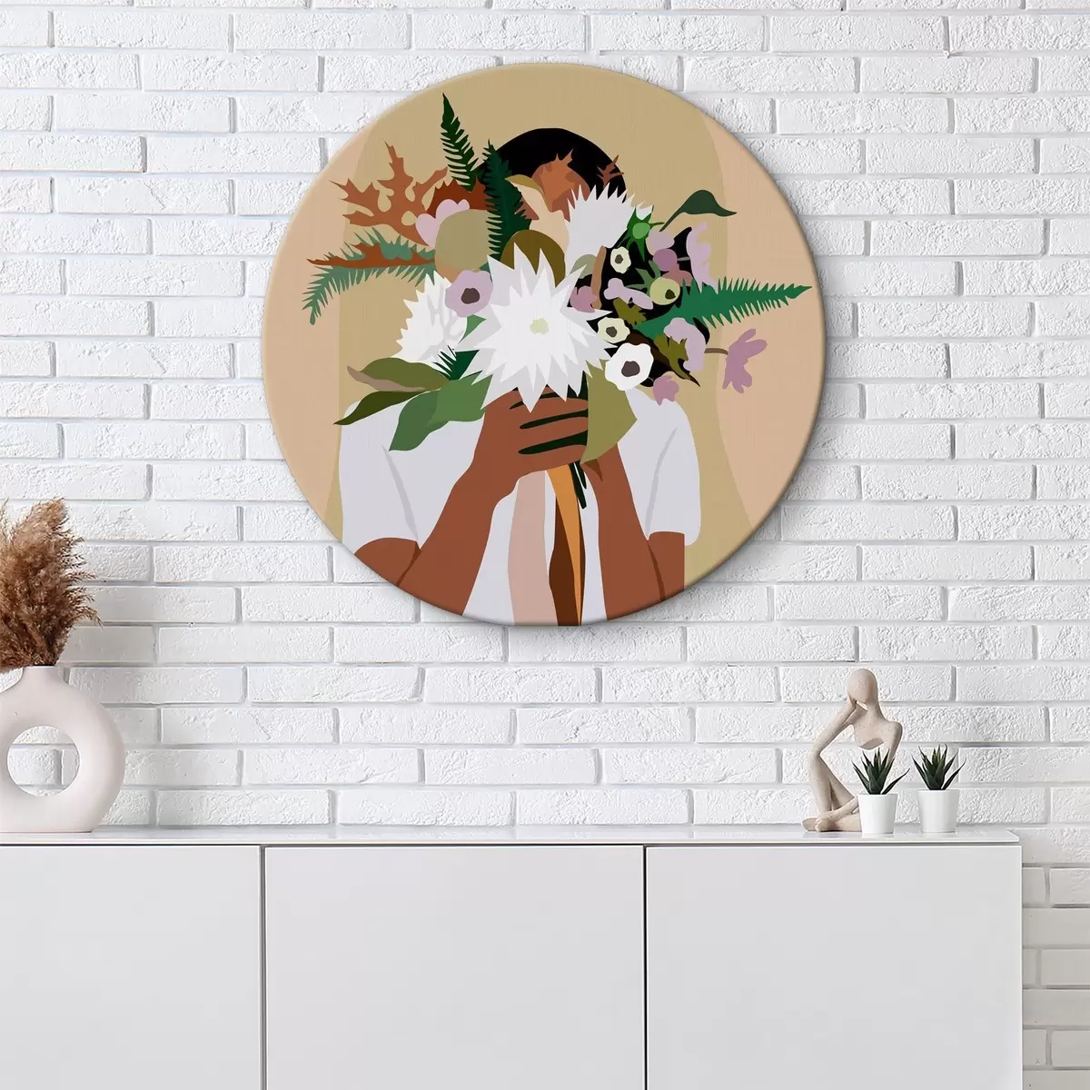 Okrągły obraz Dziewczyna z bukietem kwiatów abstrakcyjny styl boho Nr r36367