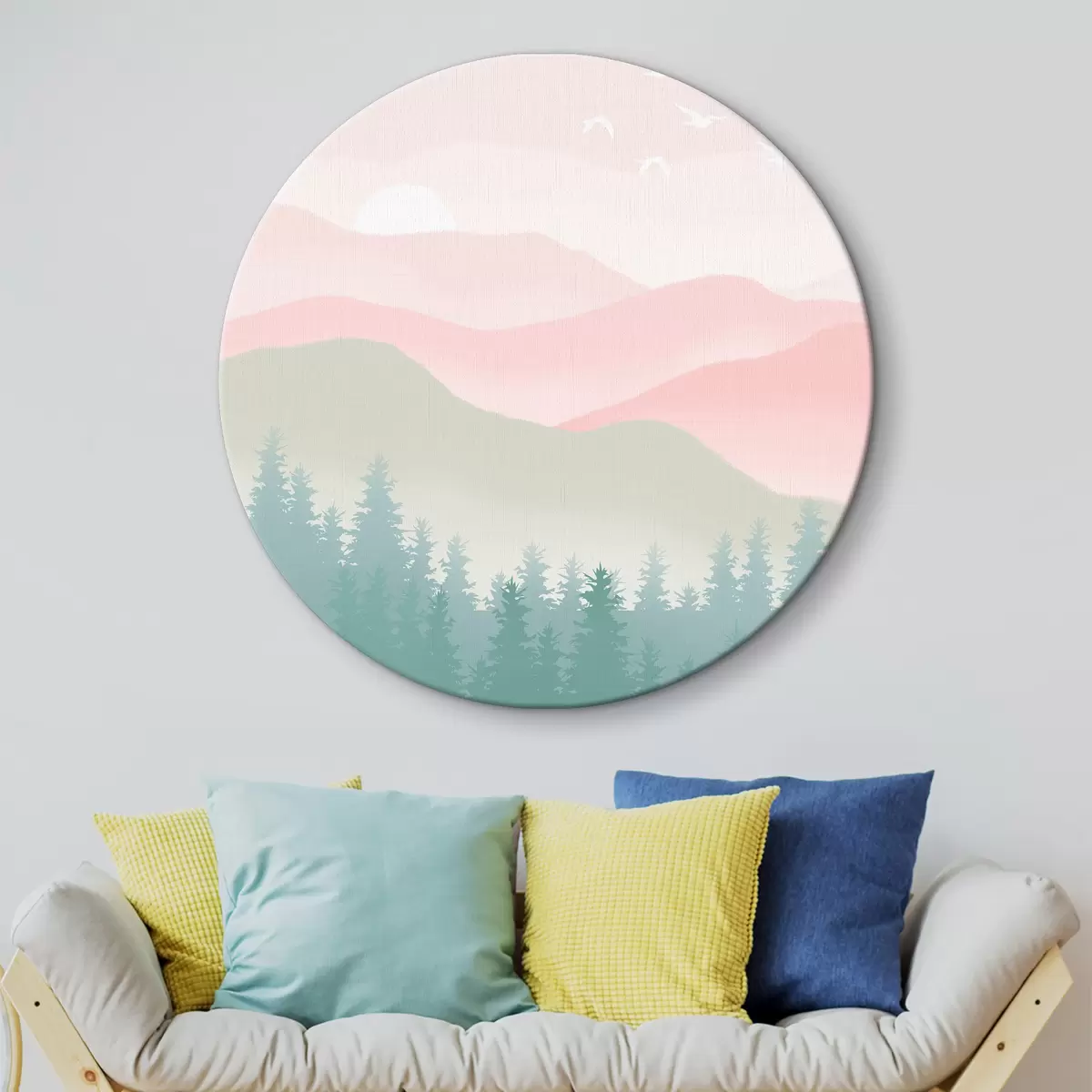 Okrągły obraz Mgliste góry z sosnowym lasem, delikatne naturalne kolory, róż i zieleń Nr r36394