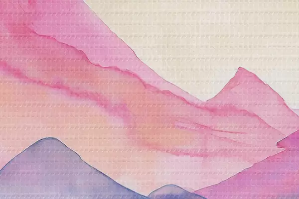 Okrągły obraz Akwarela górski krajobraz, wschód słońca, delikatne fioletowe, różowe i niebieskie kolory Nr r36496