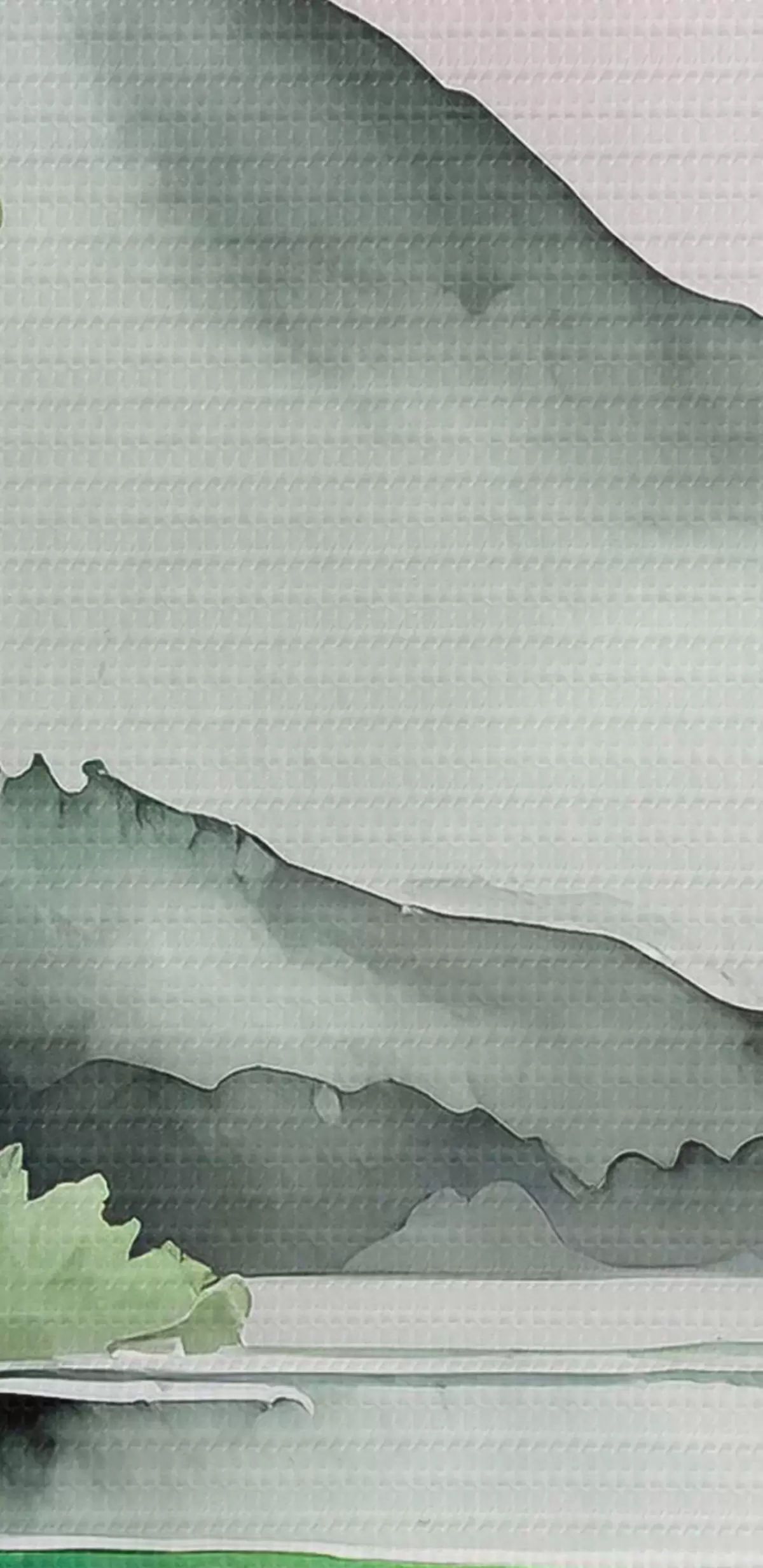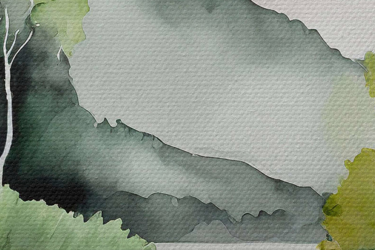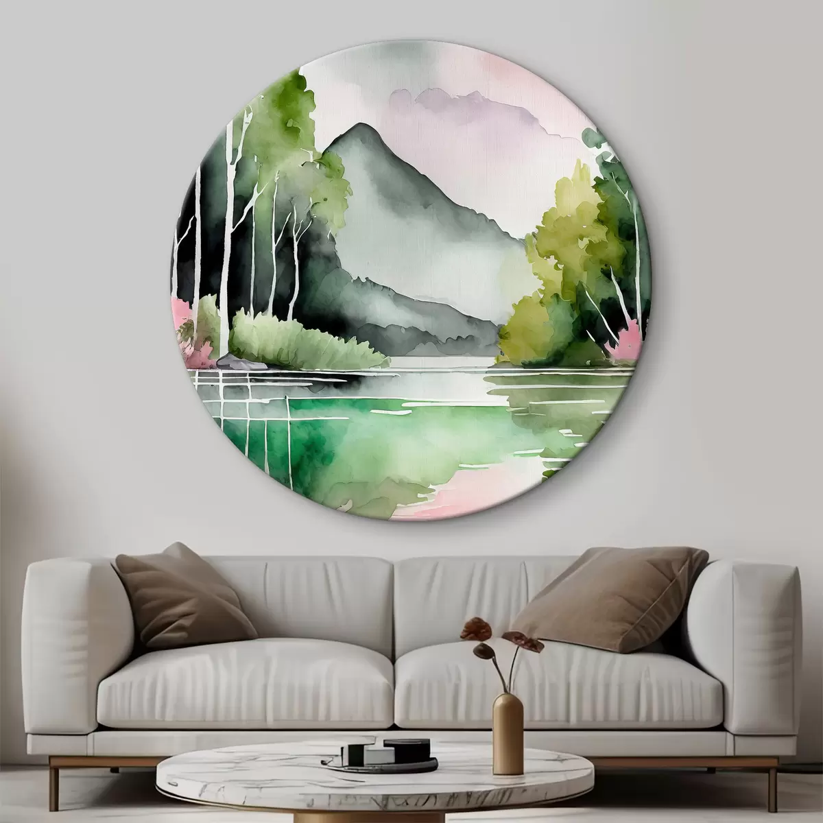 Okrągły obraz Akwarela krajobraz natury, jezioro i las, miękkie kolory zielony, różowy i szary Nr r36507