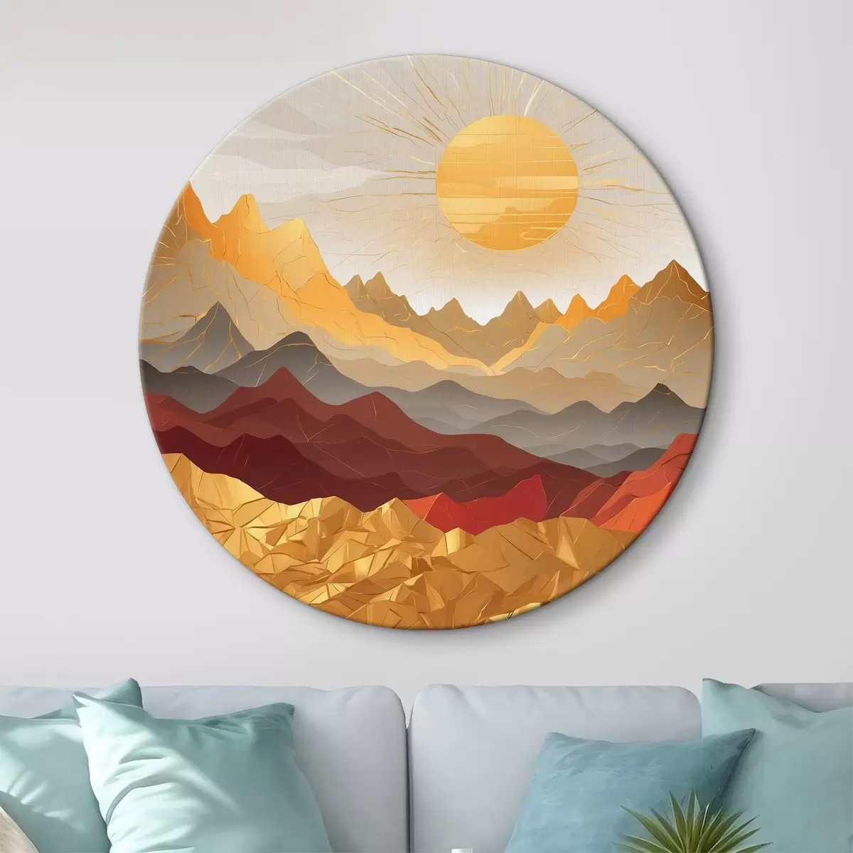 Okrągły obraz Wschód słońca nad geometrycznym krajobrazem górskim Nr r36529
