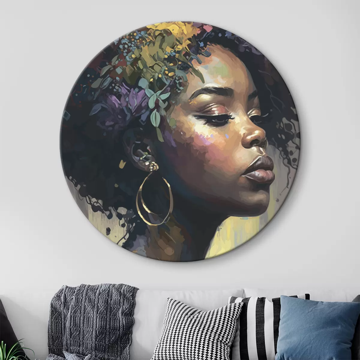 Okrągły obraz Piękna czarna kobieta z kolorowymi włosami Nr r36577