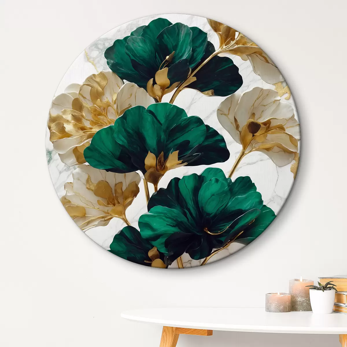 Okrągły obraz Zielone i białe kwiaty na białym marmurowym tle Nr r36646