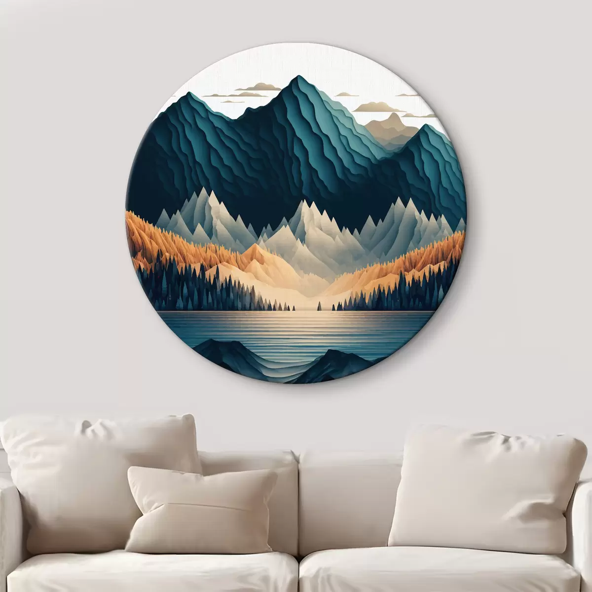 Okrągłe obrazy Pasmo górskie z drzewami i jeziorem r36697