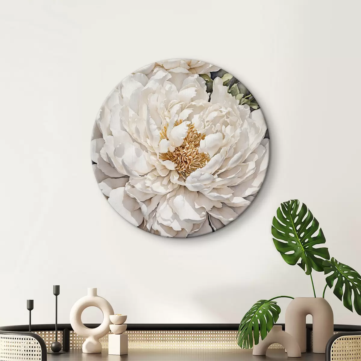 Okrągły obraz Biała piwonia na szarym tle Nr r37160