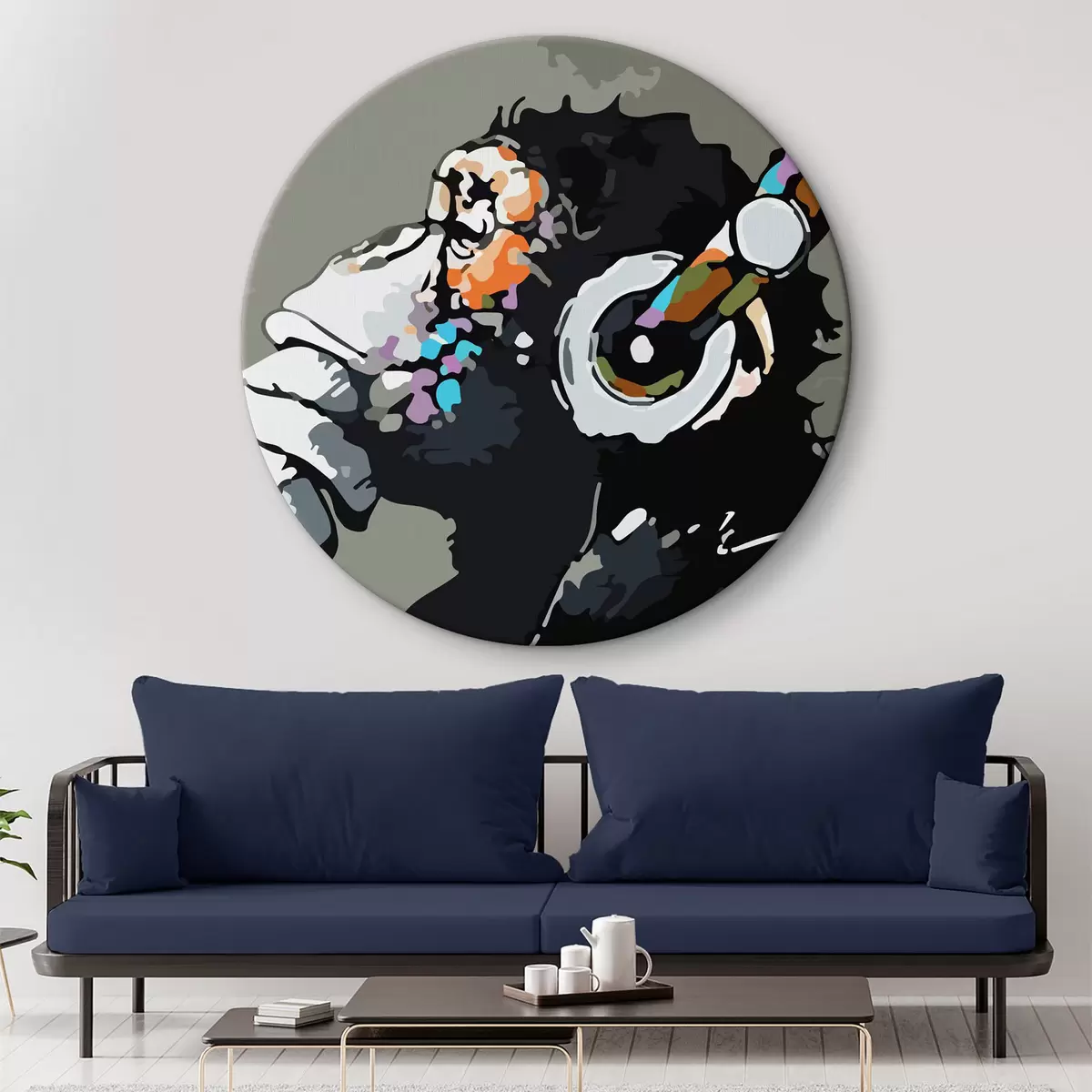 Okrągły obraz Małpa w słuchawkach na szarym tle Nr r37269