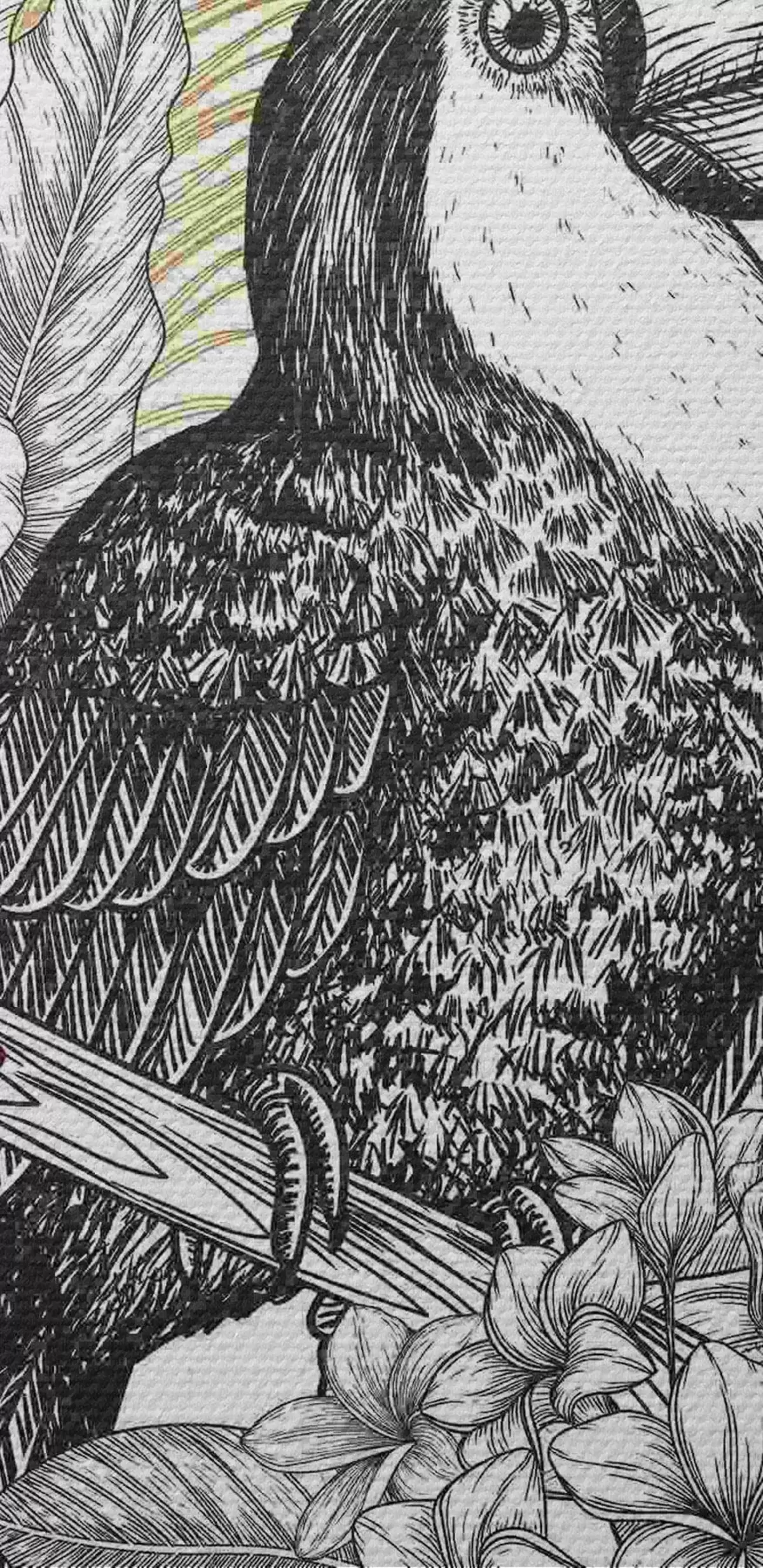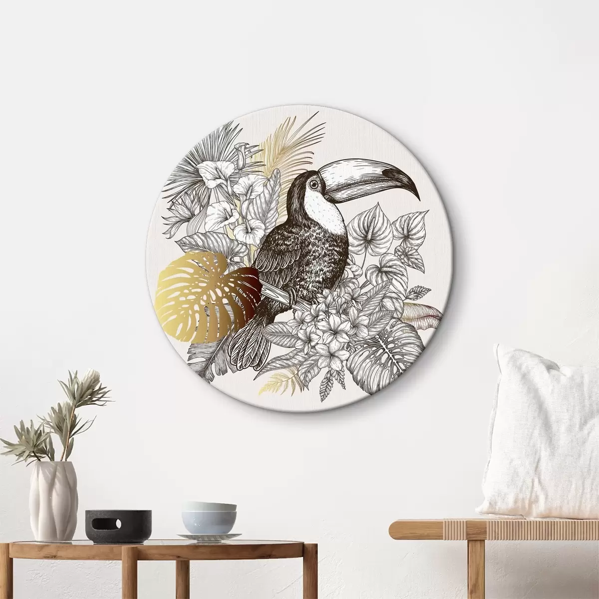 Okrągły obraz Tukan z liśćmi i kwiatami Nr r37303