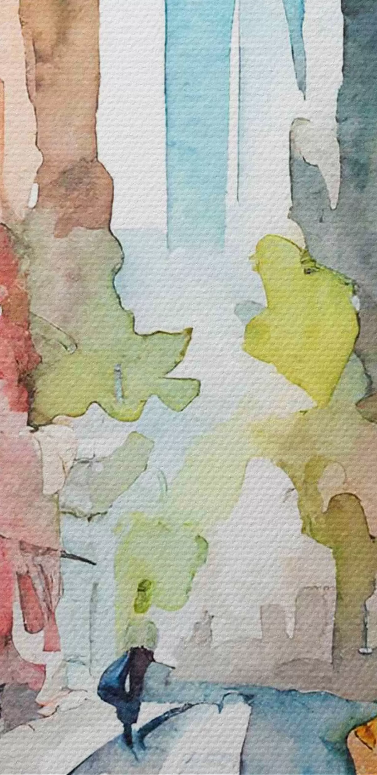 Okrągły obraz Akwarela przedstawiająca ulicę z budynkami i wysoką wieżą w tle Nr r37346