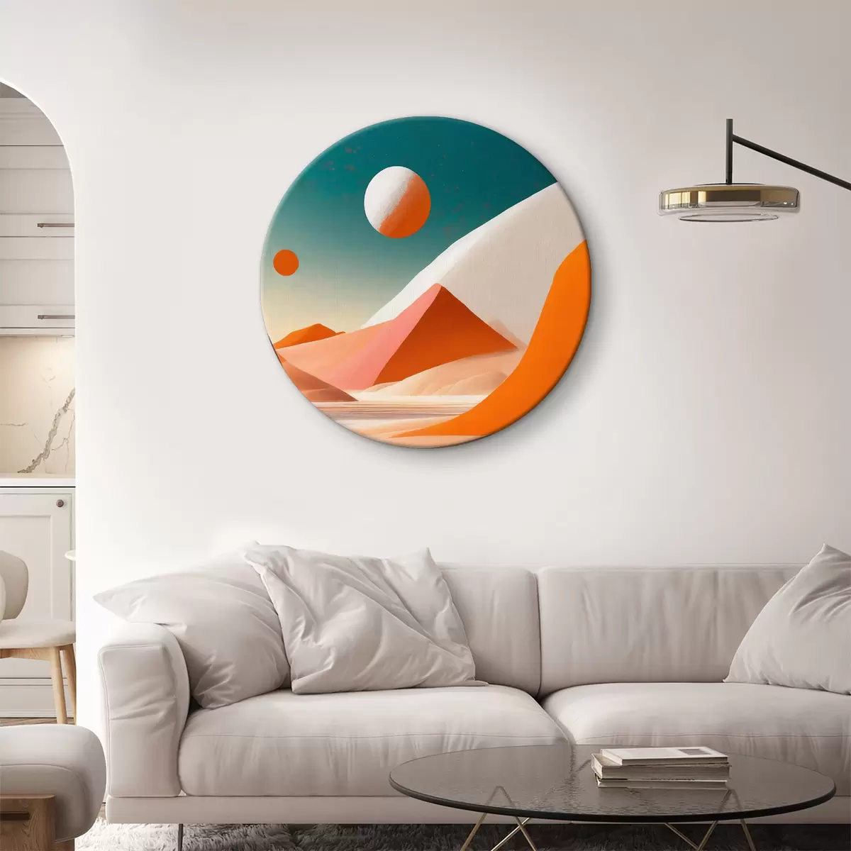 Okrągły obraz Pustynny krajobraz z piaszczystymi wzgórzami i zbiornikiem wodnym Nr r37367
