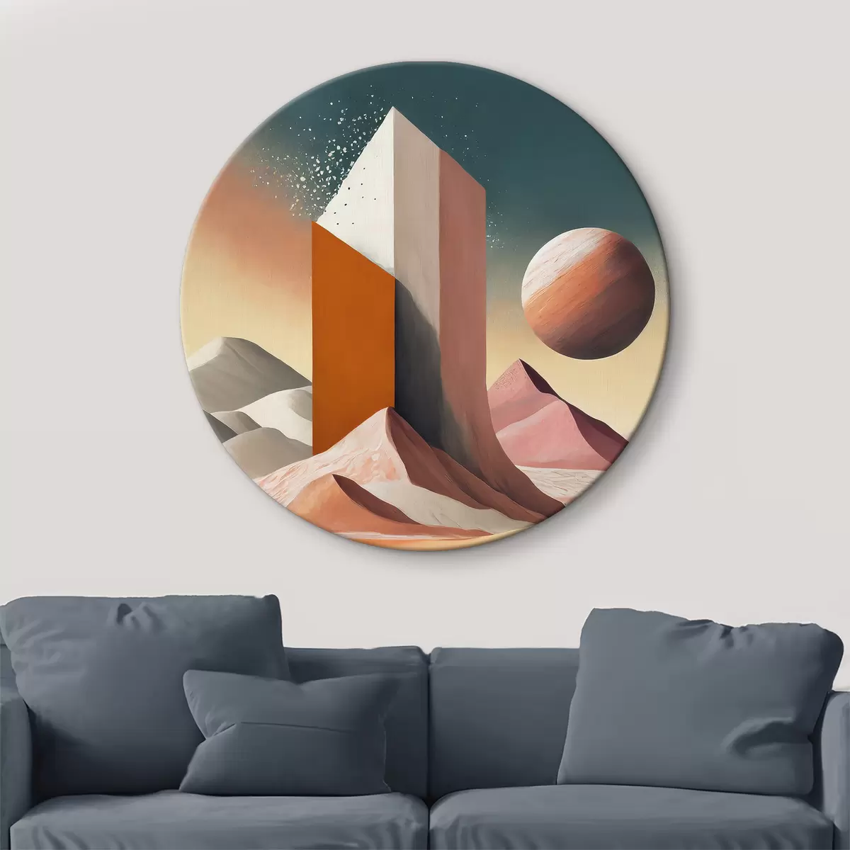 Okrągły obraz Sztuka futurystyczna, pustynia, figury geometryczne, palmy, różowy i pomarańczowy, planeta Nr r37369
