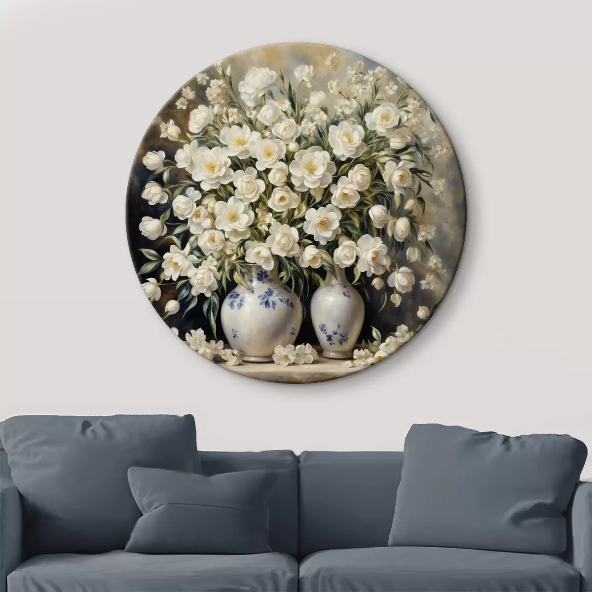 Okrągły obraz Biały wazon z dużym bukietem białych kwiatów Nr r37440