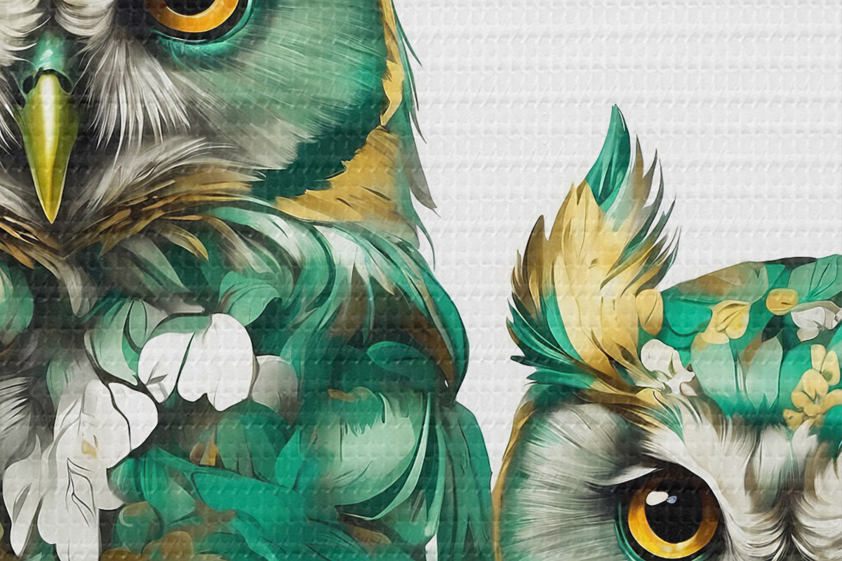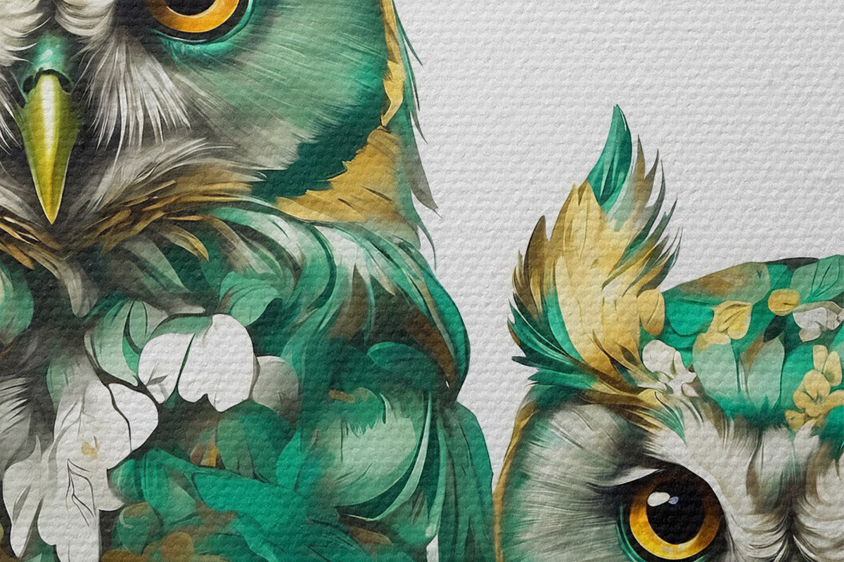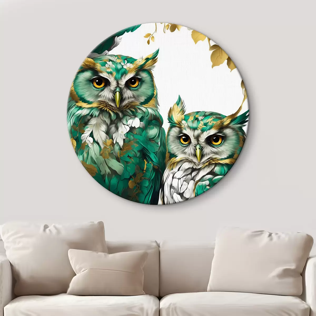 Okrągły obraz Dwie zielone sowy w liściach Nr r37569
