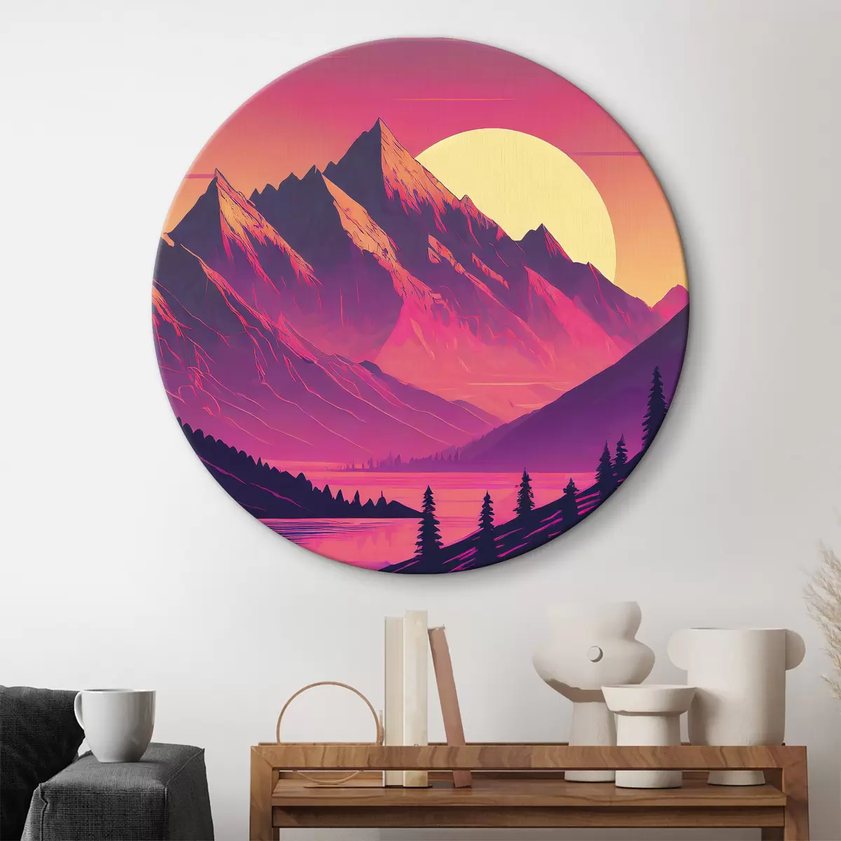 Okrągłe obrazy Abstrakcyjny krajobraz górski, żywe kolory, różowy, zachód słońca, futurystyczny, słońce, las r38000