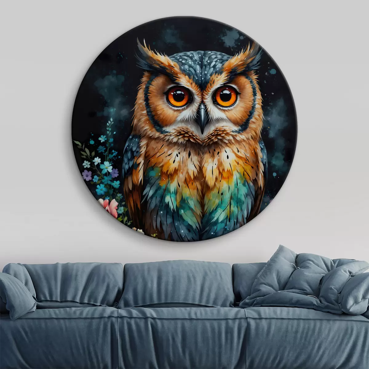 Okrągły obraz Sowa z kwiatami Nr r38066
