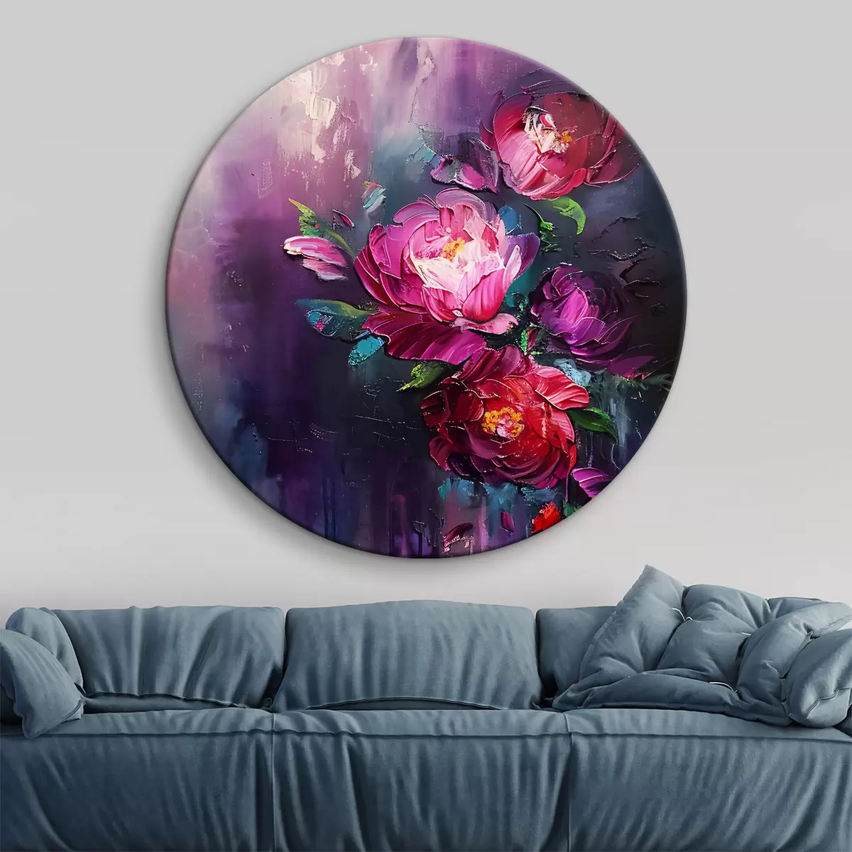 Okrągłe obrazy Malowanie róż, kwitnących kwiatów w stylu malarstwa olejnego, na ciemnofioletowym tle r38108