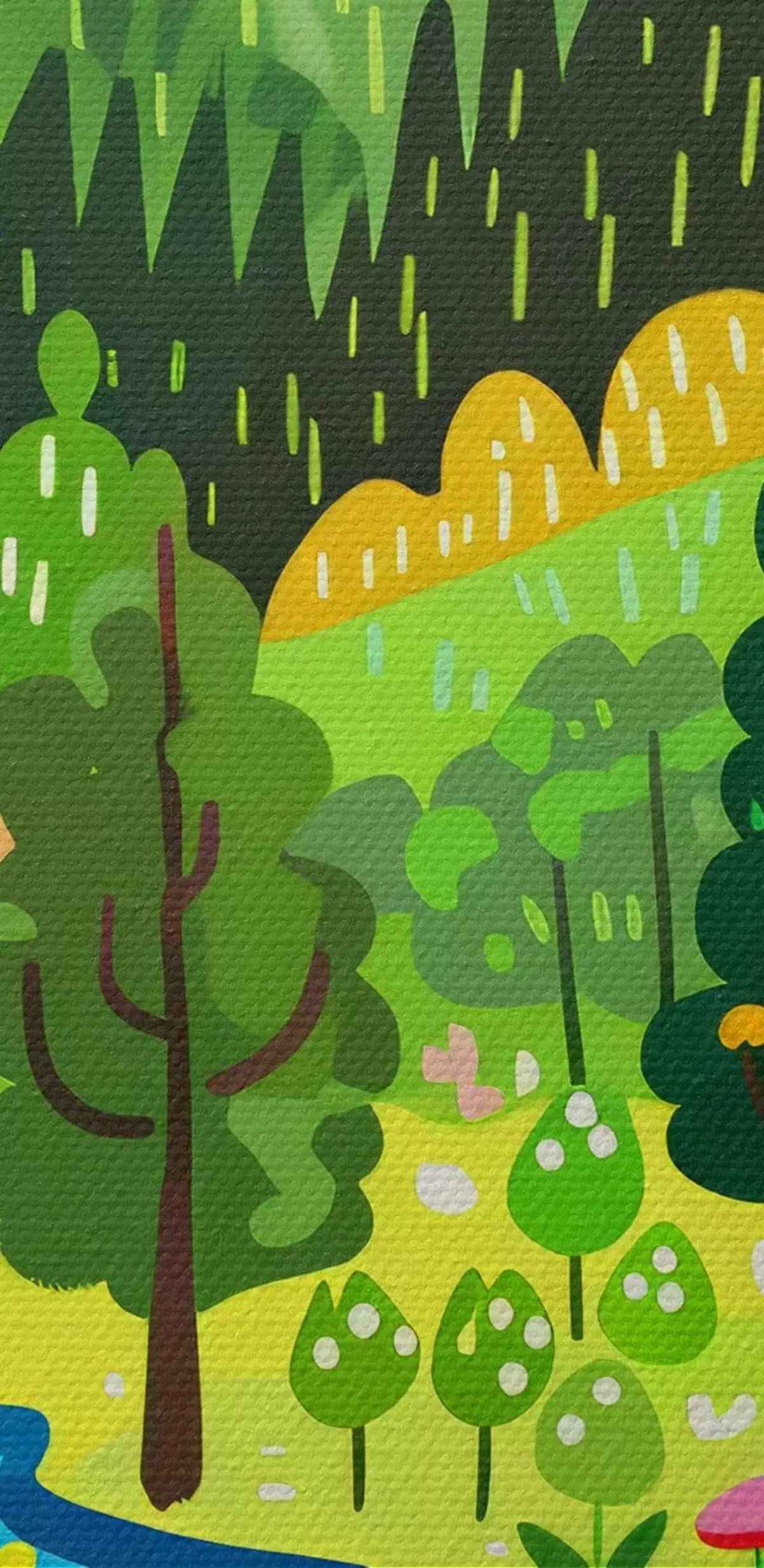 Okrągły obraz Kreskówkowy krajobraz z drzewami i kwiatami Nr r38140