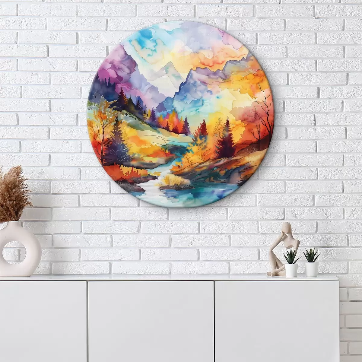 Okrągłe obrazy Kolorowy górski krajobraz z drzewami i rzeką r38145