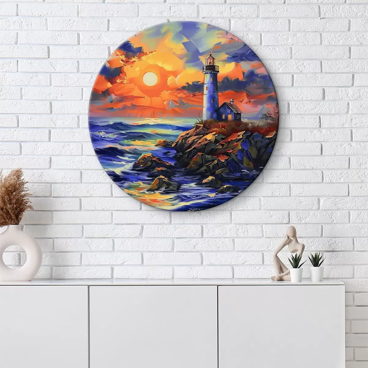 Okrągły obraz Latarnia morska o zachodzie słońca na brzegu Nr r38150