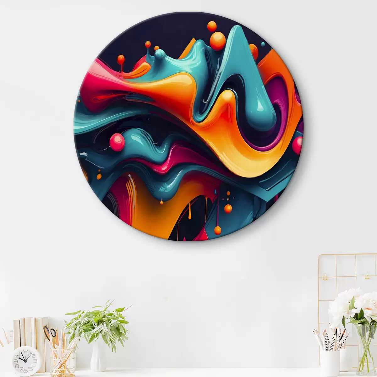 Okrągły obraz Kolorowe abstrakcyjne płynne kształty z żywymi tonami, dynamiczna i surrealistyczna kompozycja Nr r38163