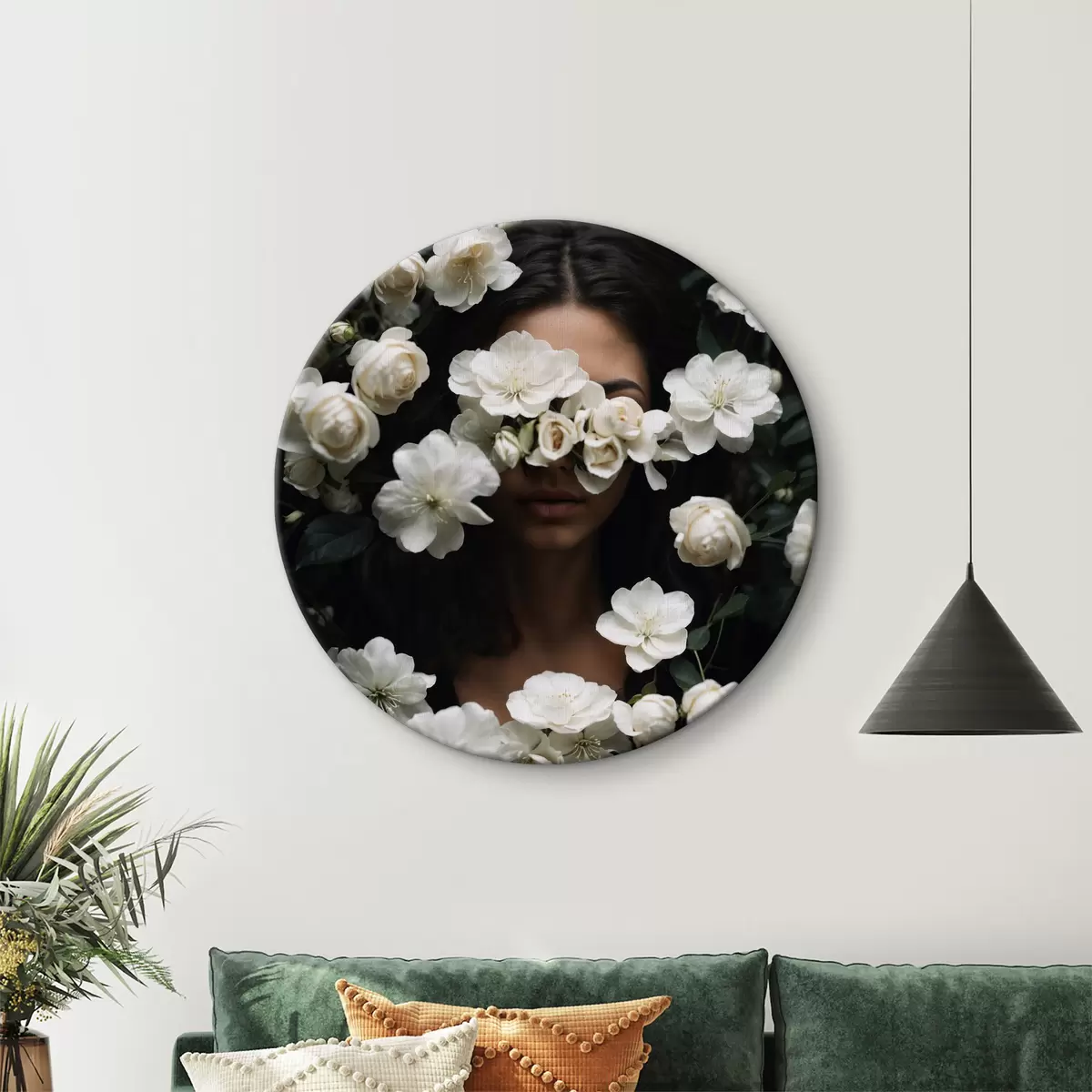 Okrągły obraz Kobieta ukrywająca twarz za białymi kwiatami Nr r38194