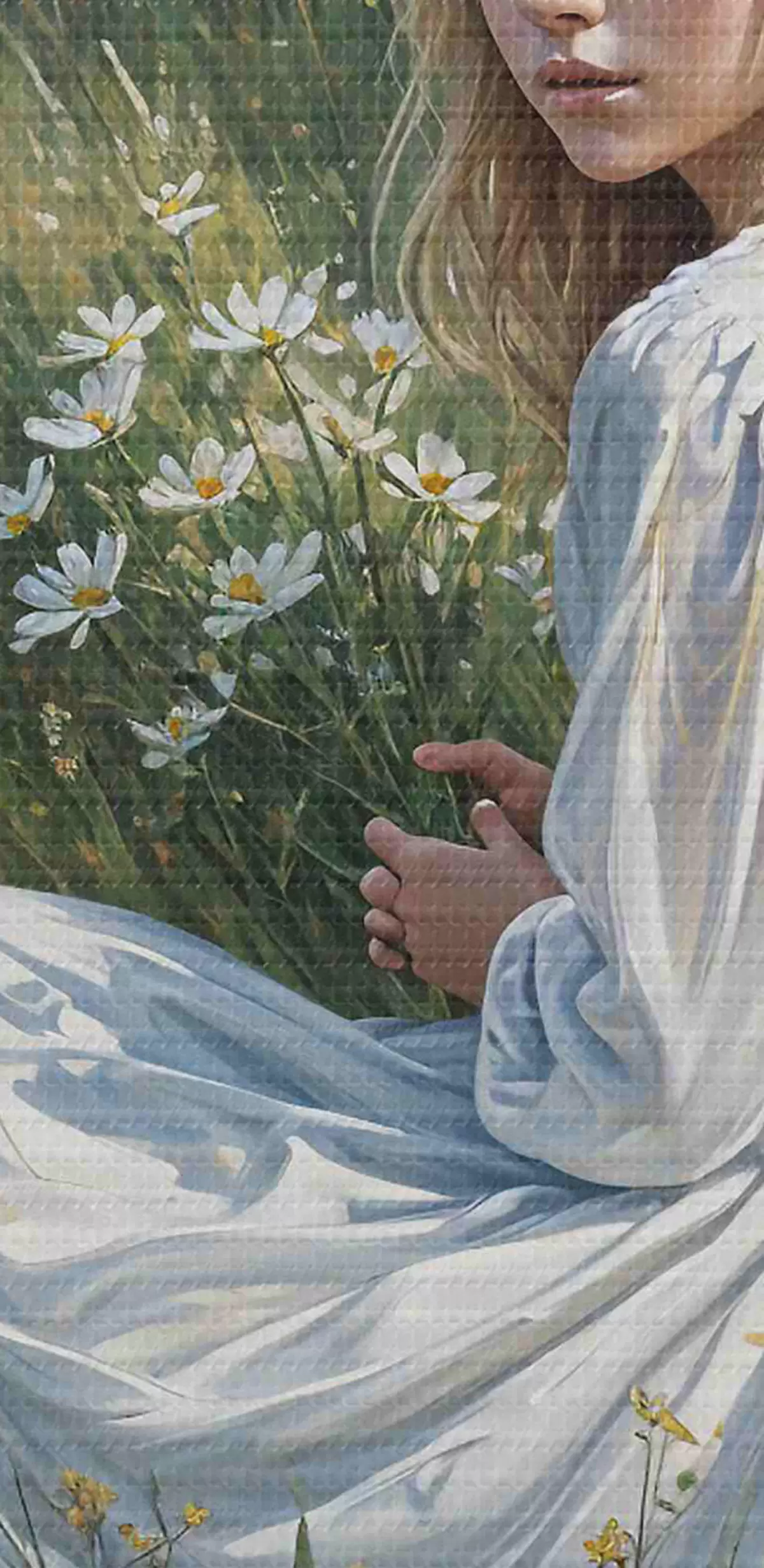 Okrągły obraz Dziewczyna w białej sukience siedząca na polu kwiatów Nr r38196