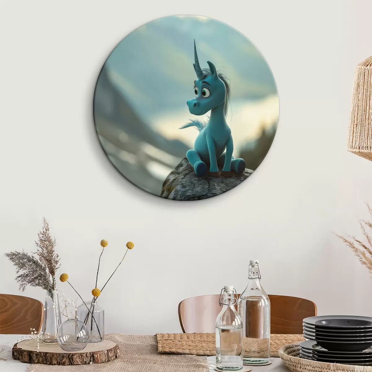Okrągły obraz Rysunek niebieskiego jednorożca siedzącego na skale Nr r38274