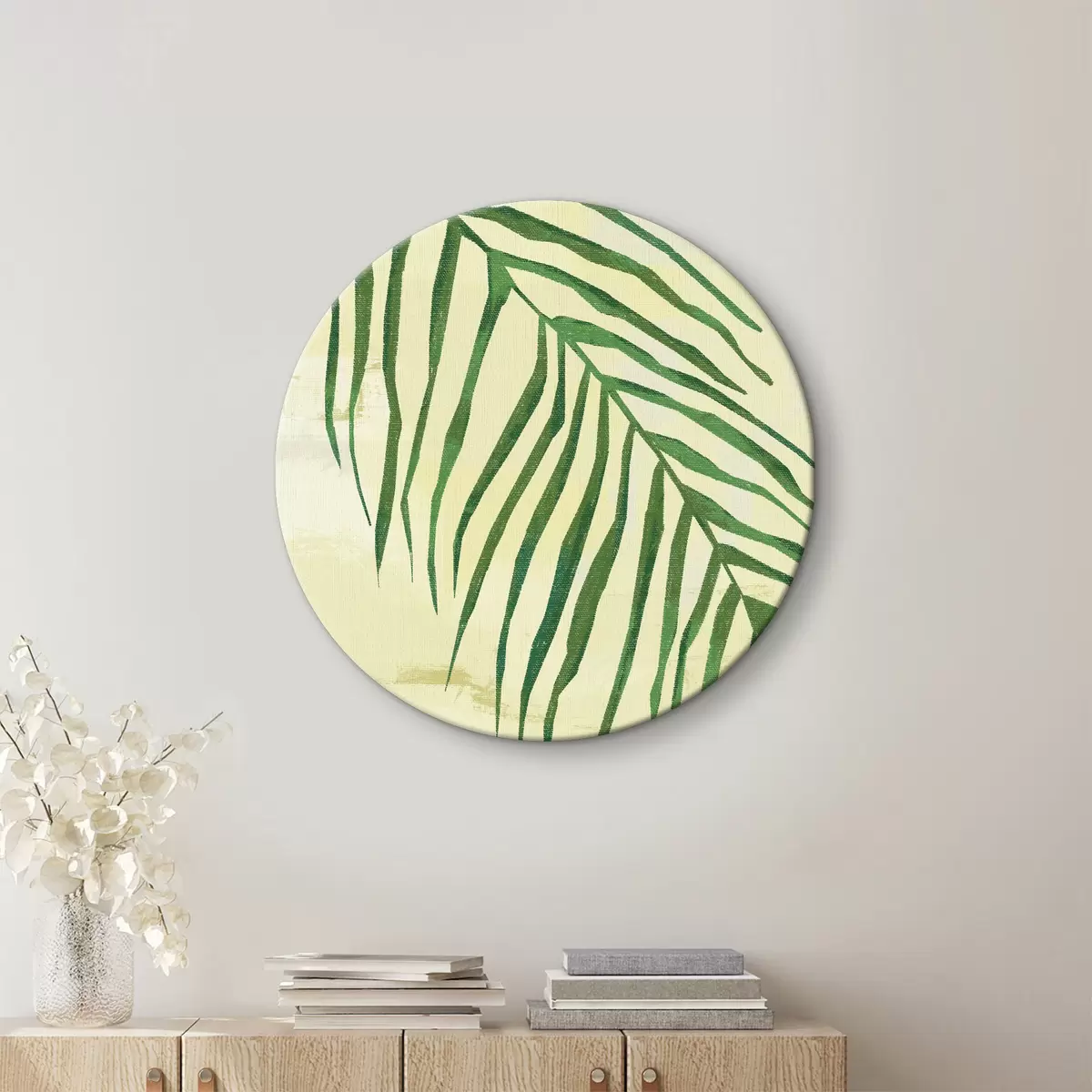 Okrągły obraz Gałąź palmowa, tropikalna, zbliżenie, roślina, cienkie liście, zielony i żółty Nr r38282