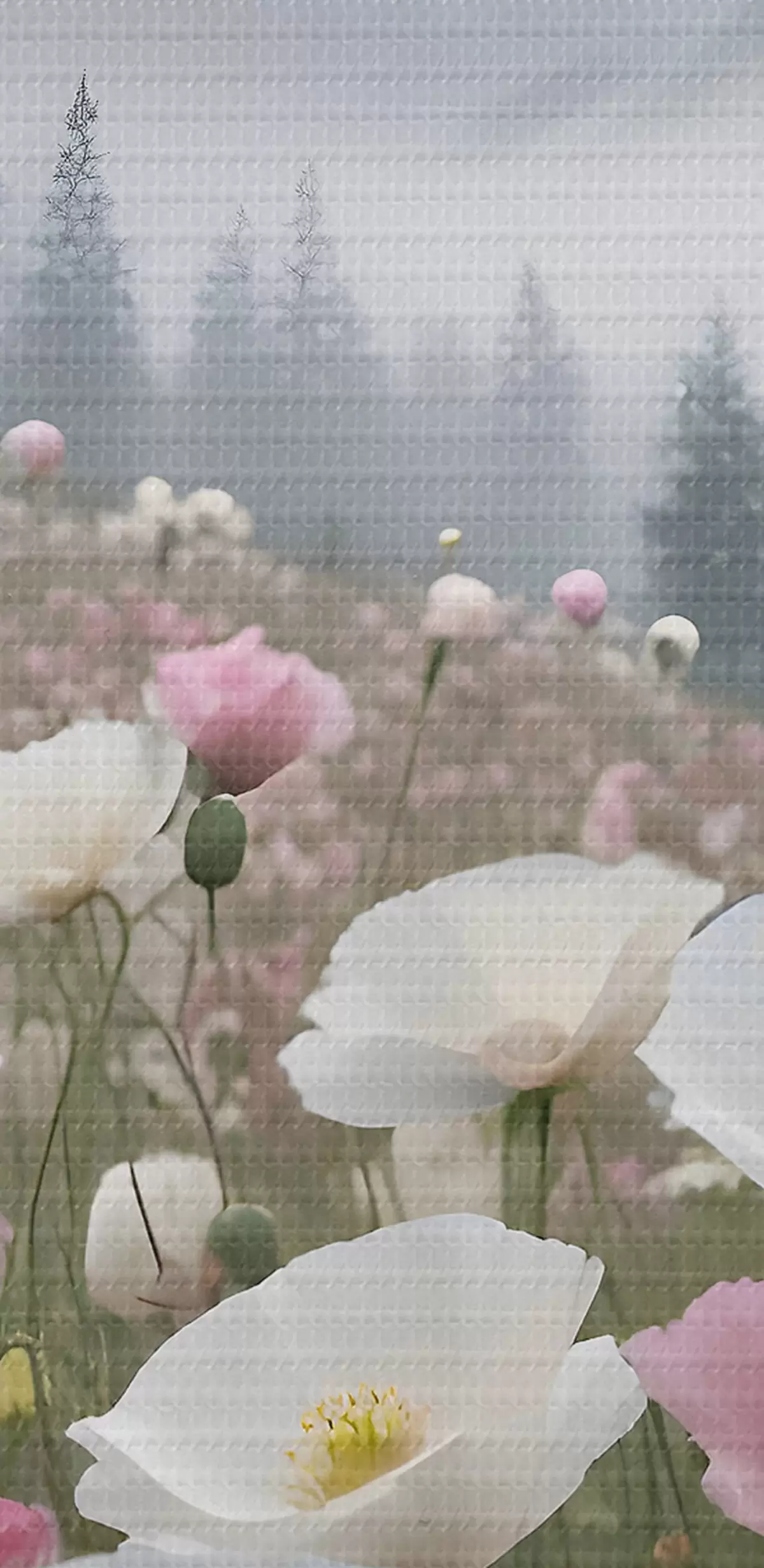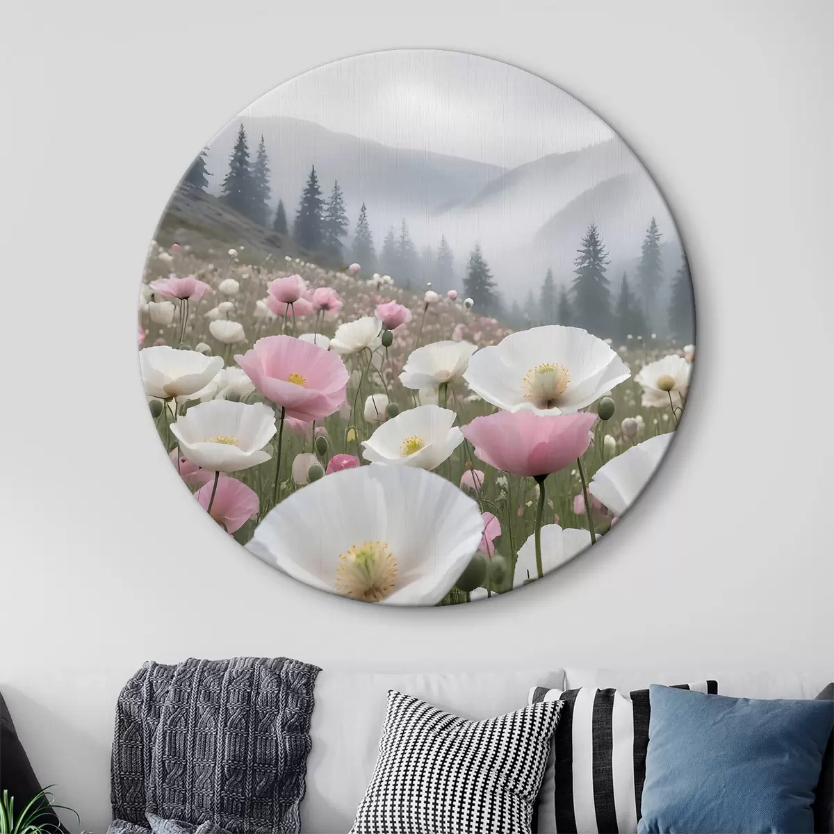 Okrągłe obrazy W tle pole różowych i białych maków w górskim krajobrazie r38369