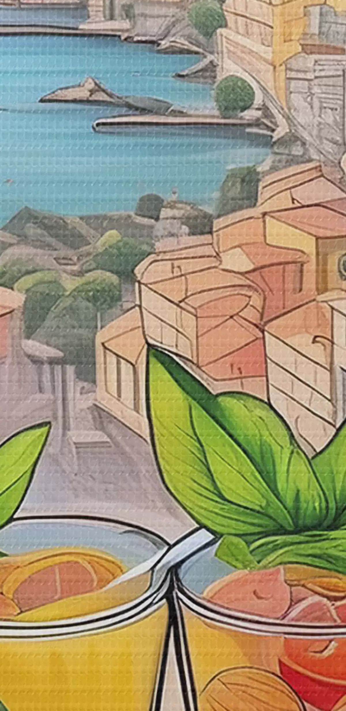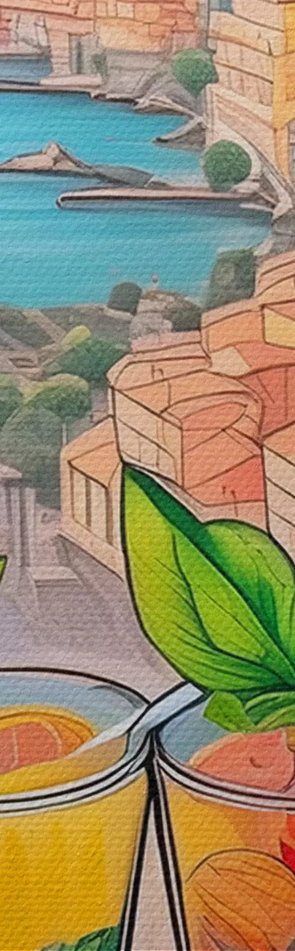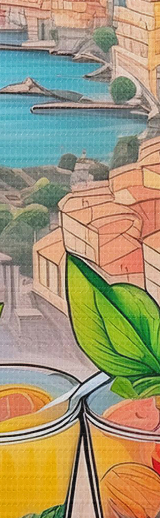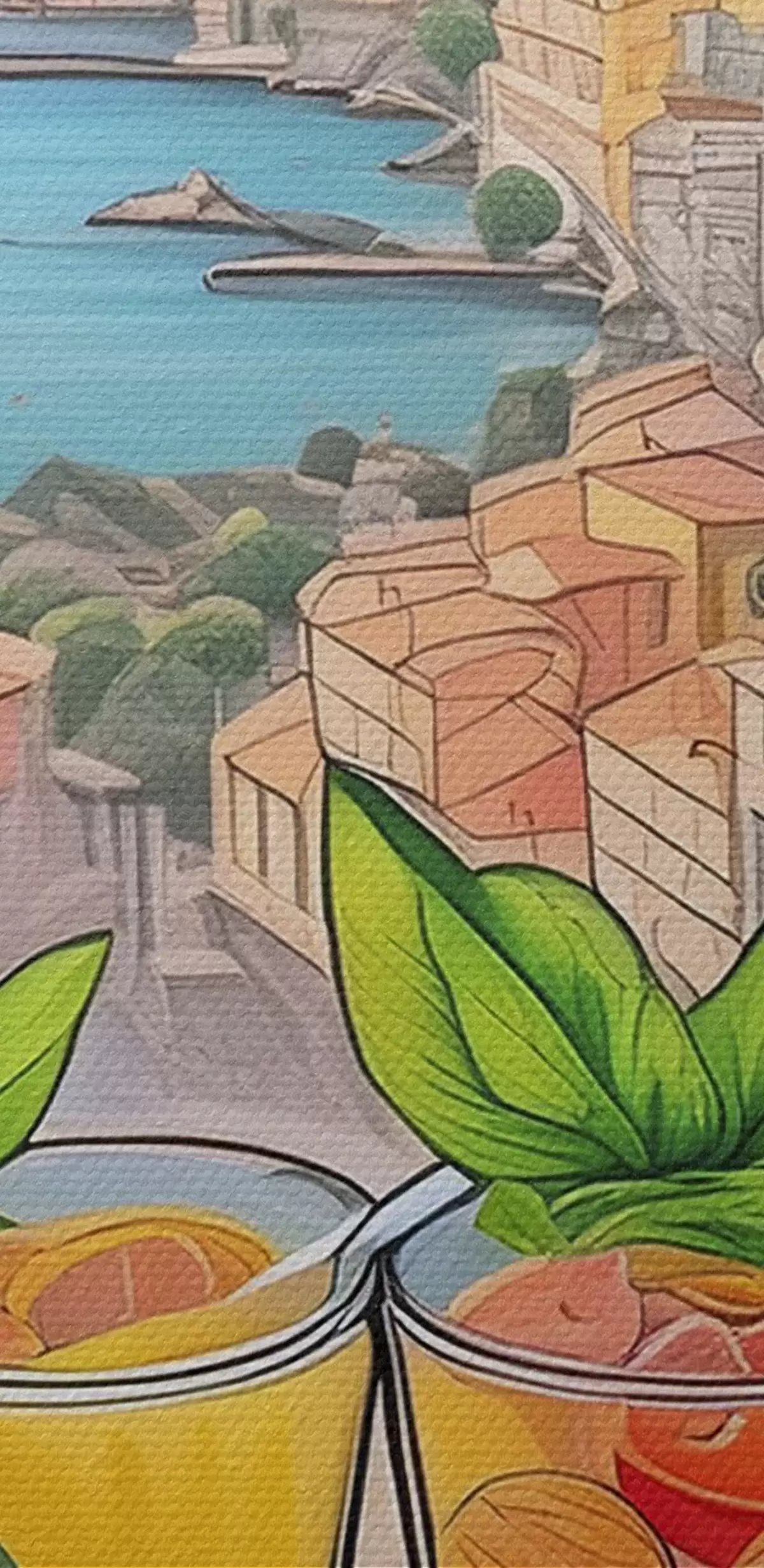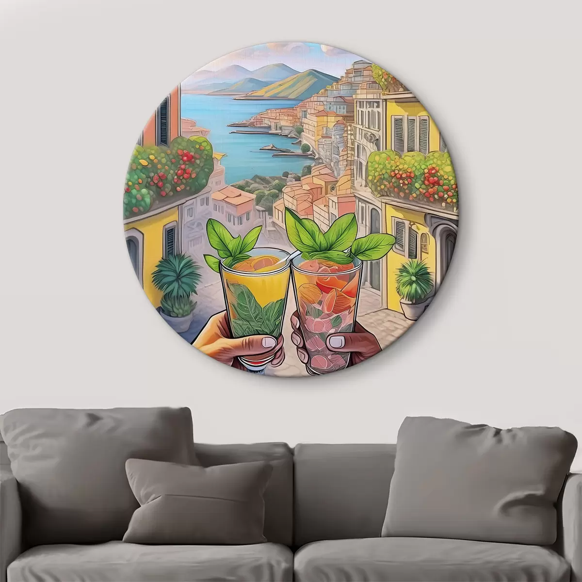 Okrągły obraz Włoskie miasto, wybrzeże morskie, koktajle, powołanie, architektura, lato, akwarela Nr r38392
