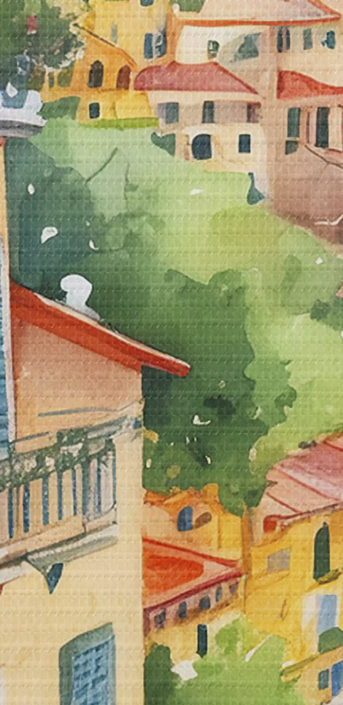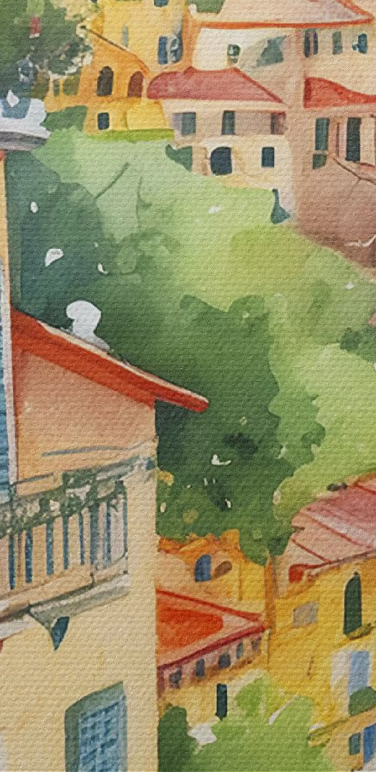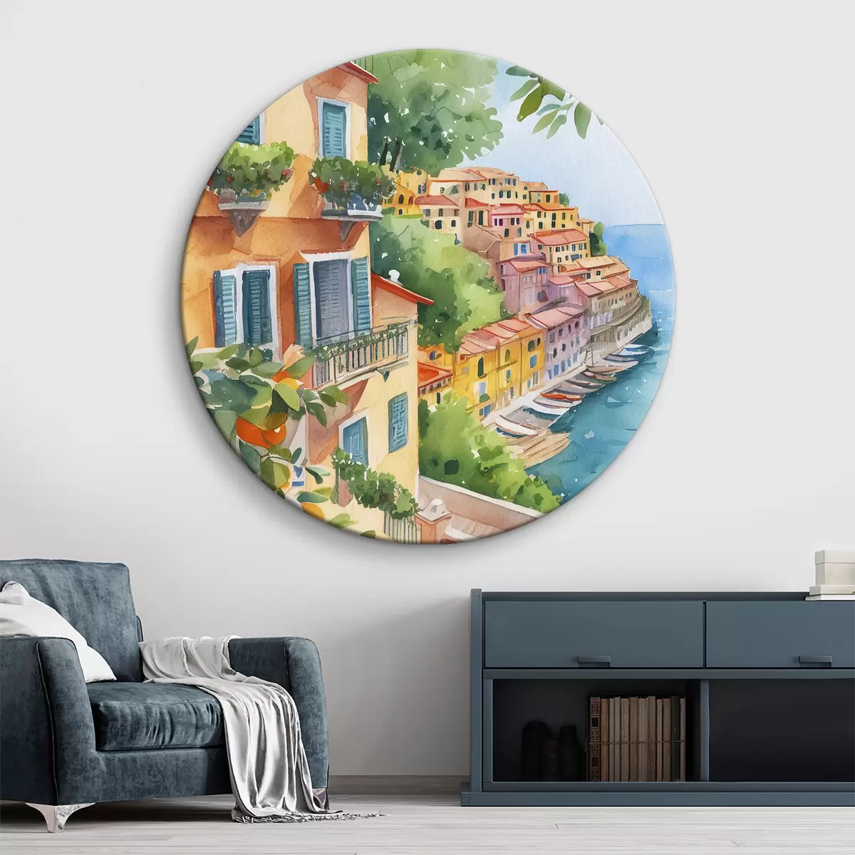 Okrągły obraz Włoska architektura miasta, wybrzeże Morza Amalfi, lato, akwarela, drzewo cytrynowe Nr r38393