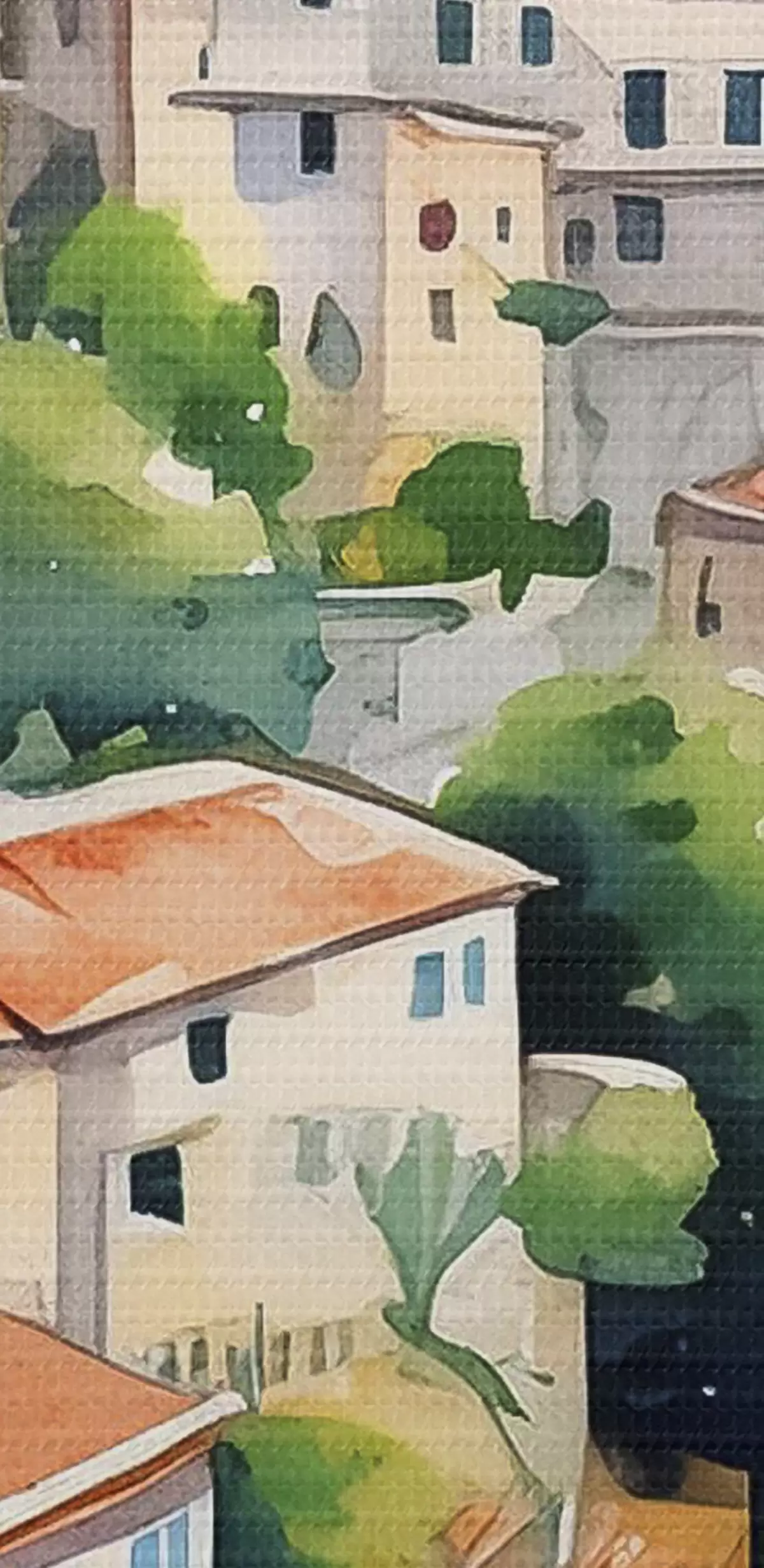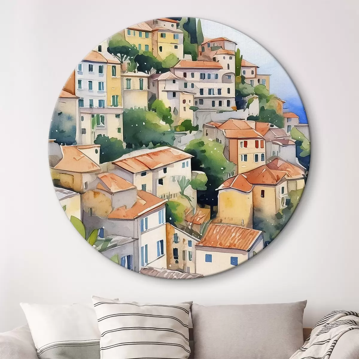 Okrągły obraz Architektura śródziemnomorska, akwarela, lato, pomarańcze, stare miasto Nr r38396