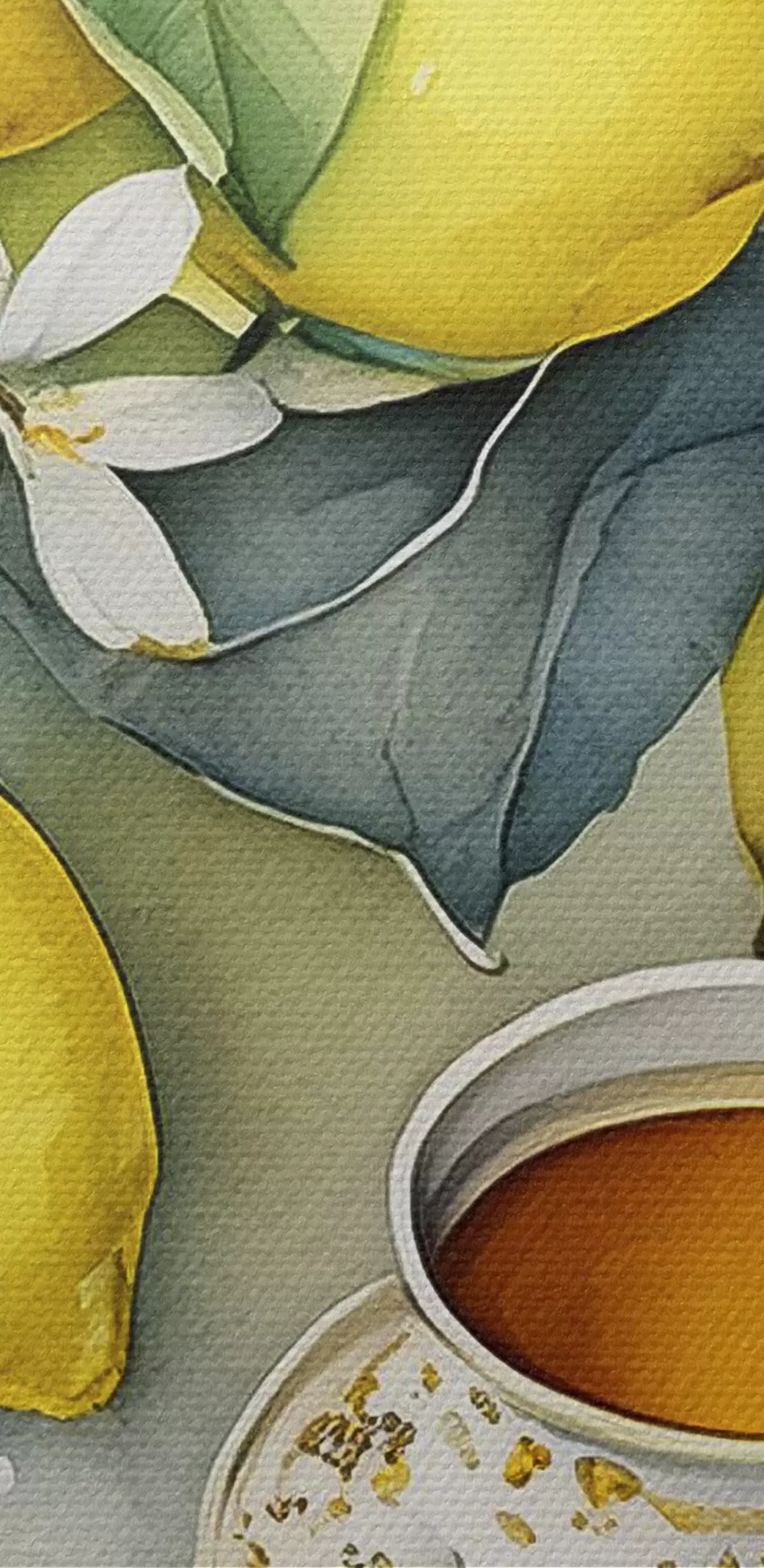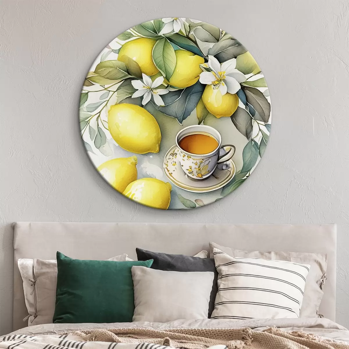 Okrągły obraz Cytryny i kwiaty, akwarela, śniadanie, filiżanka herbaty, styl boho Nr r38403