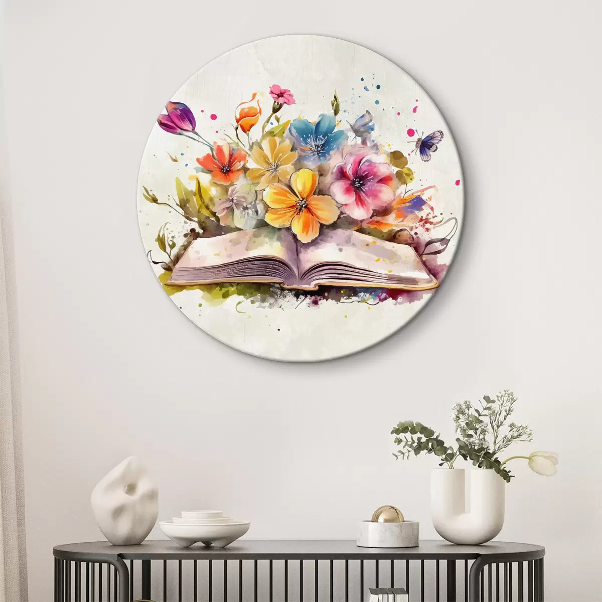 Okrągłe obrazy otwarta książka z kwiatami, farbą akwarelową r38446
