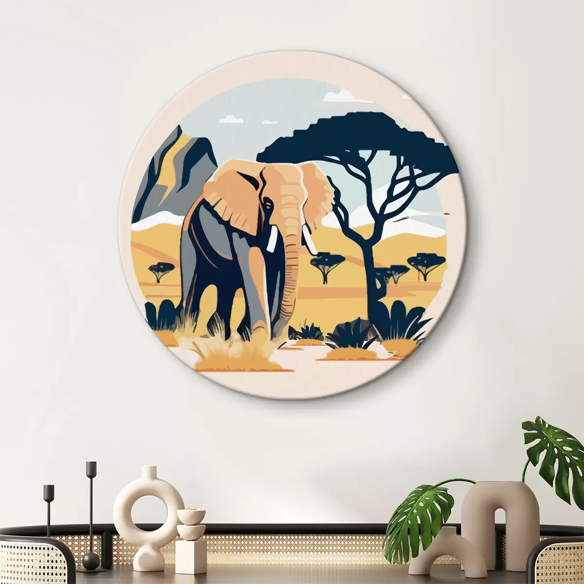 Okrągłe obrazy słoń, drzewa, góry, safari, pastel r38448