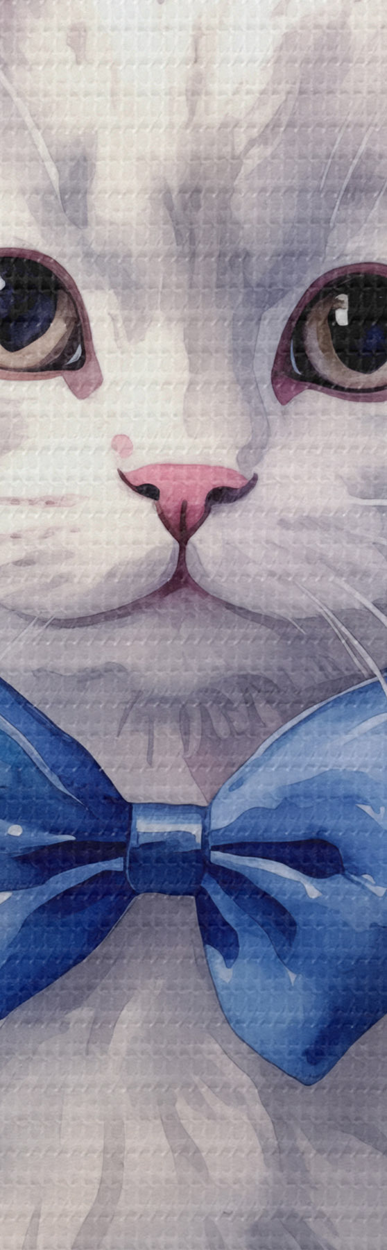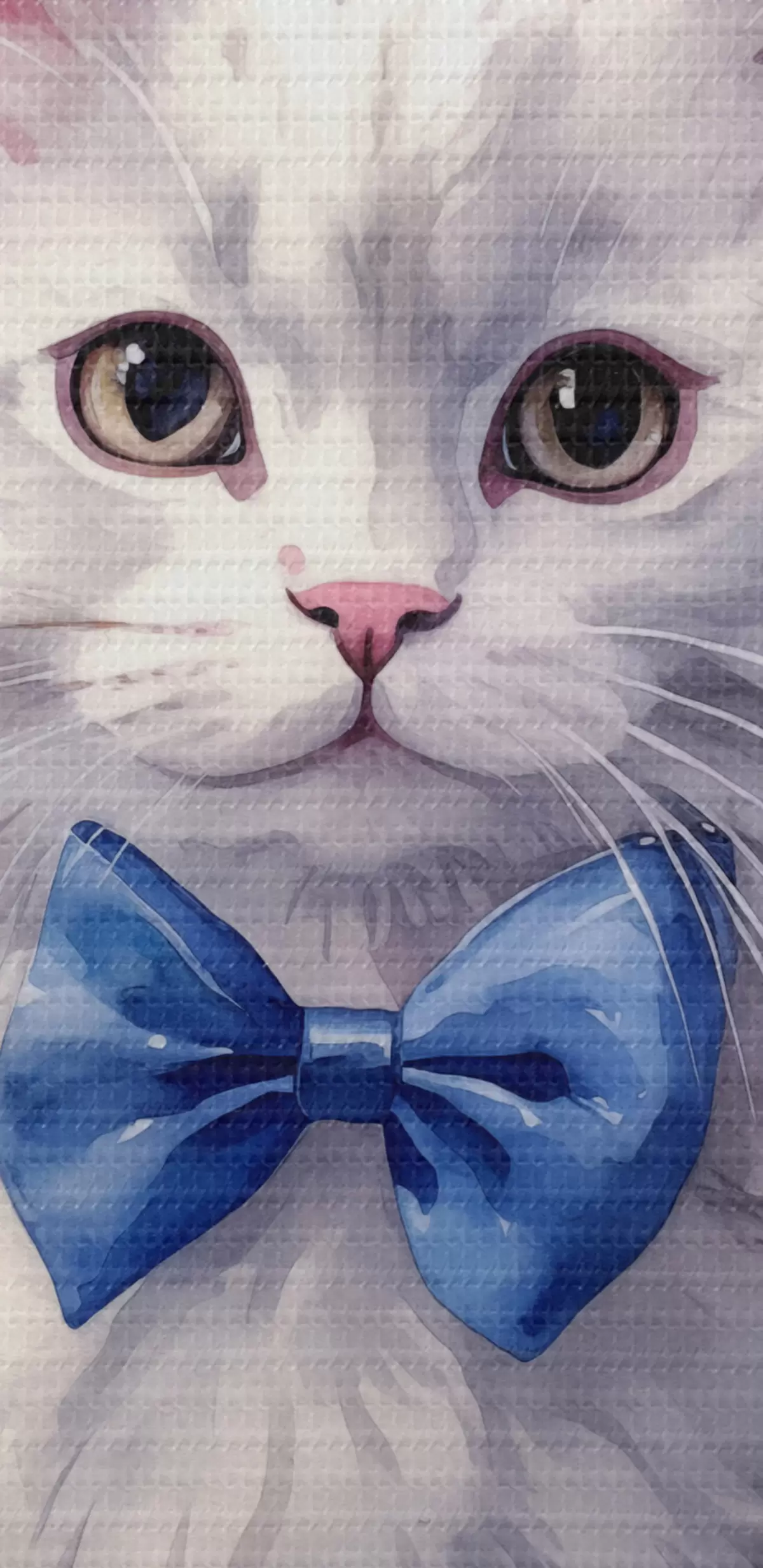 Okrągły obraz Biały puszysty kot z niebieską kokardką na szyi, akwarela, zwierzęcy, kolor szary, biały, różowy, niebieski Nr r38479