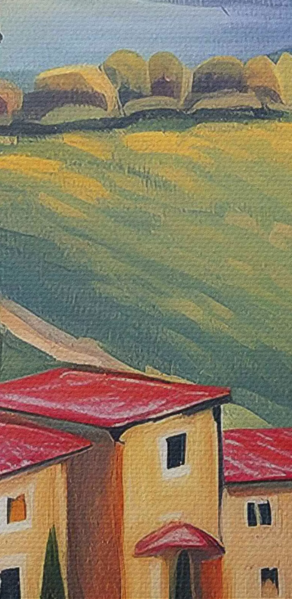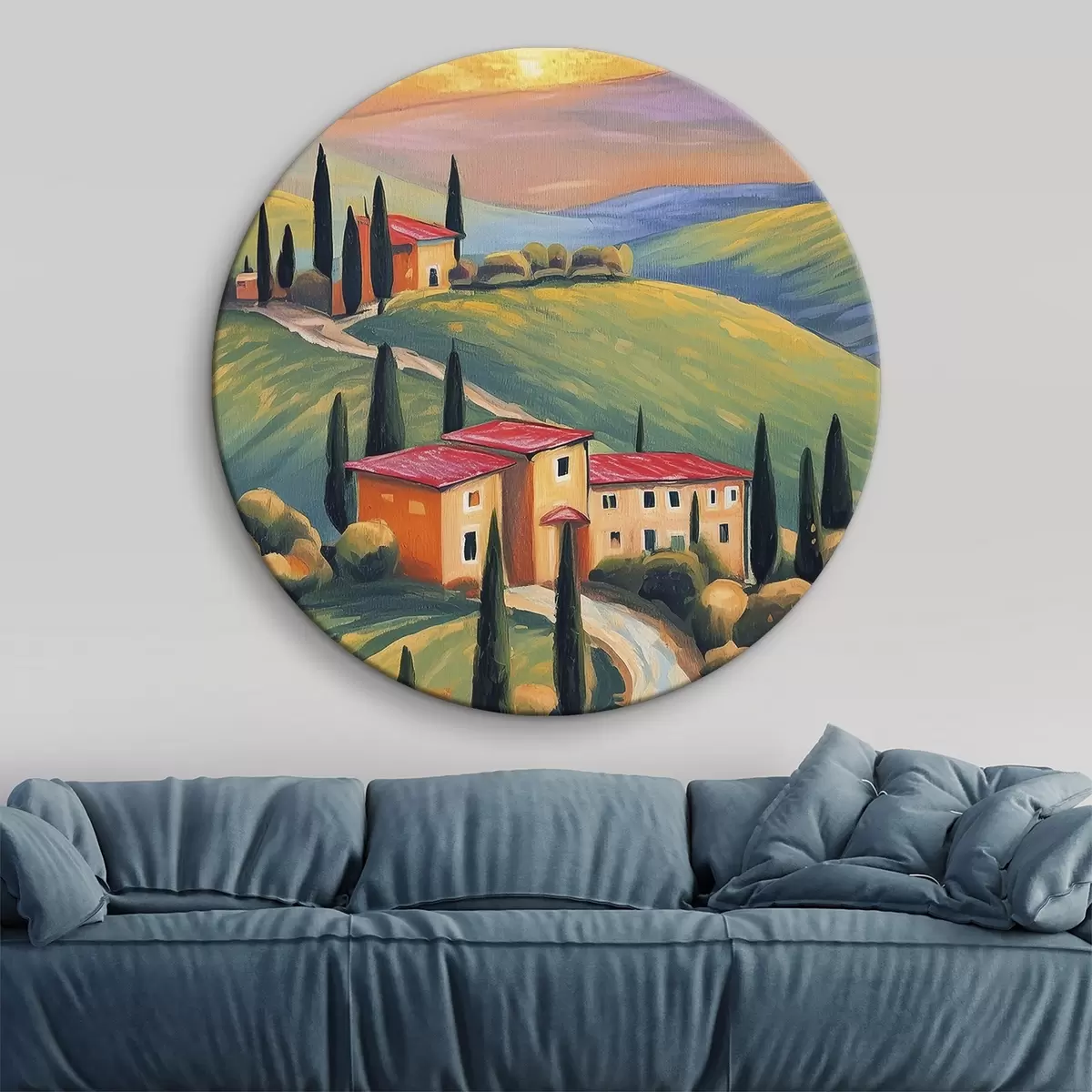 Okrągły obraz Pejzaże Toskanii, Włochy, akryl, stare domy, pola, lato Nr r38488