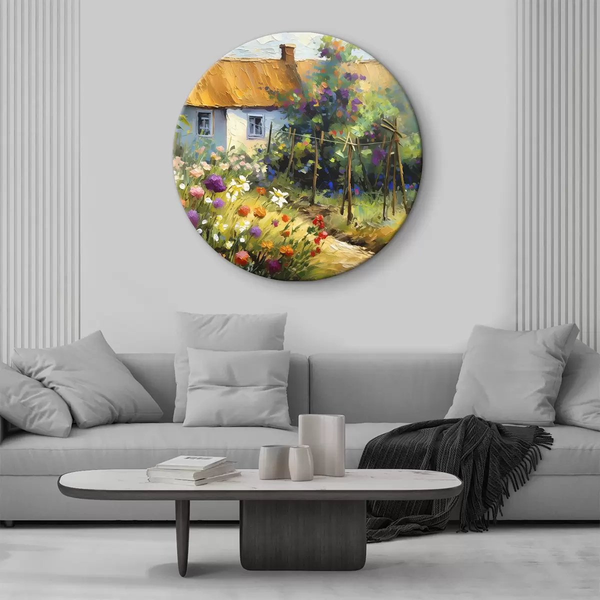 Okrągłe obrazy Lato na wsi, farba olejna, dom wiejski, drzewa i kwiaty, ogród, styl rustykalny r38490