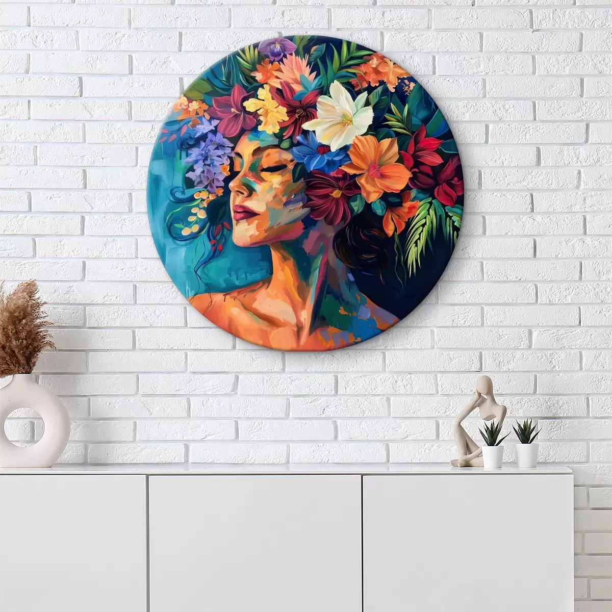 Okrągły obraz Obraz przedstawiający kobietę z kwiatami we włosach Nr r38574