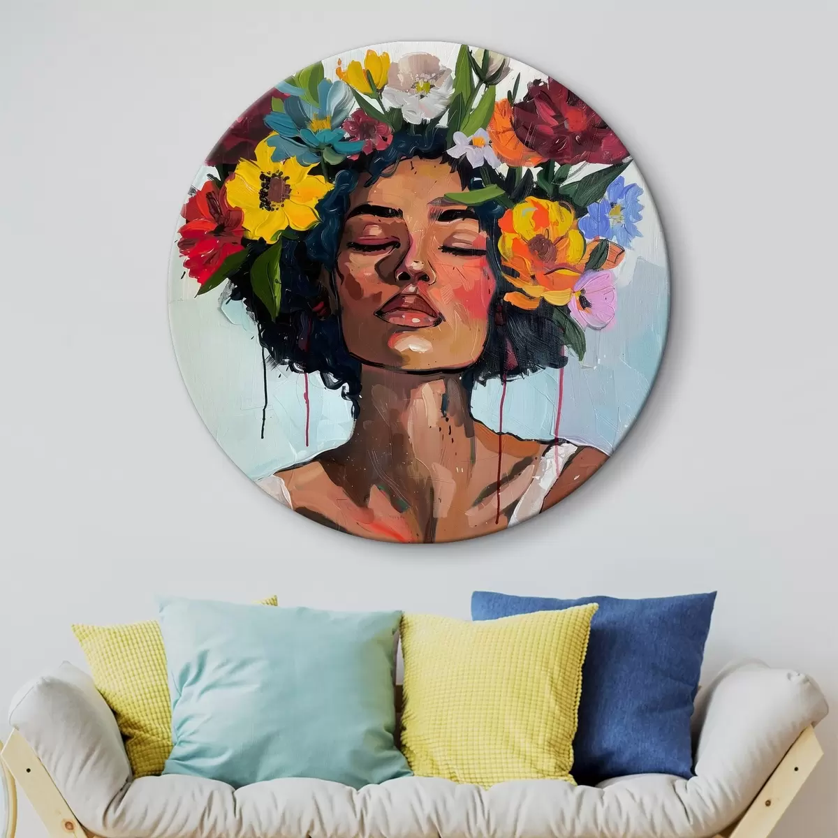 Okrągły obraz Obraz przedstawiający kobietę z kwiatami we włosach Nr r38575